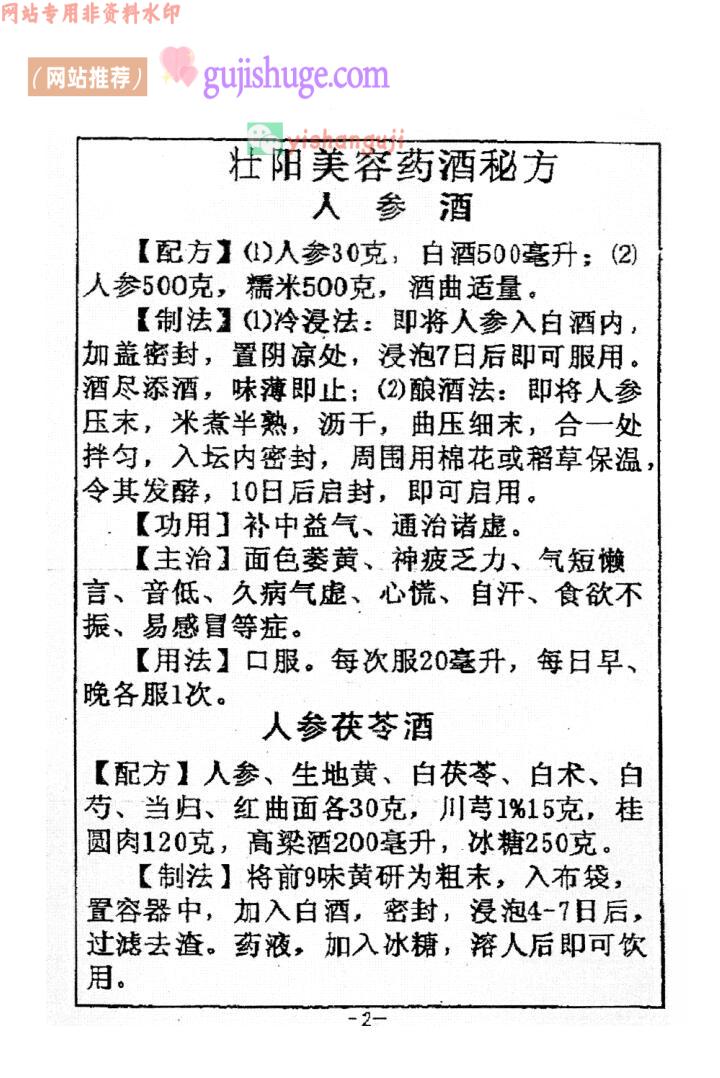 内容有:人参酒,清宫大补酒,御龙酒,助阳益寿酒,健步酒,仙茅助阳酒,清宫换春酒,十仙酒,还童酒,健康补肾酒,驻颜酒,枸杞酒,固本酒,鸡子美容酒,雄鸡酒等。