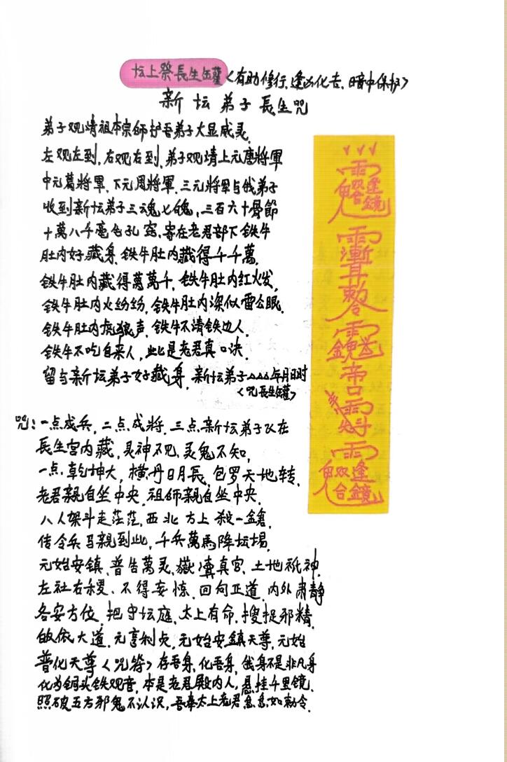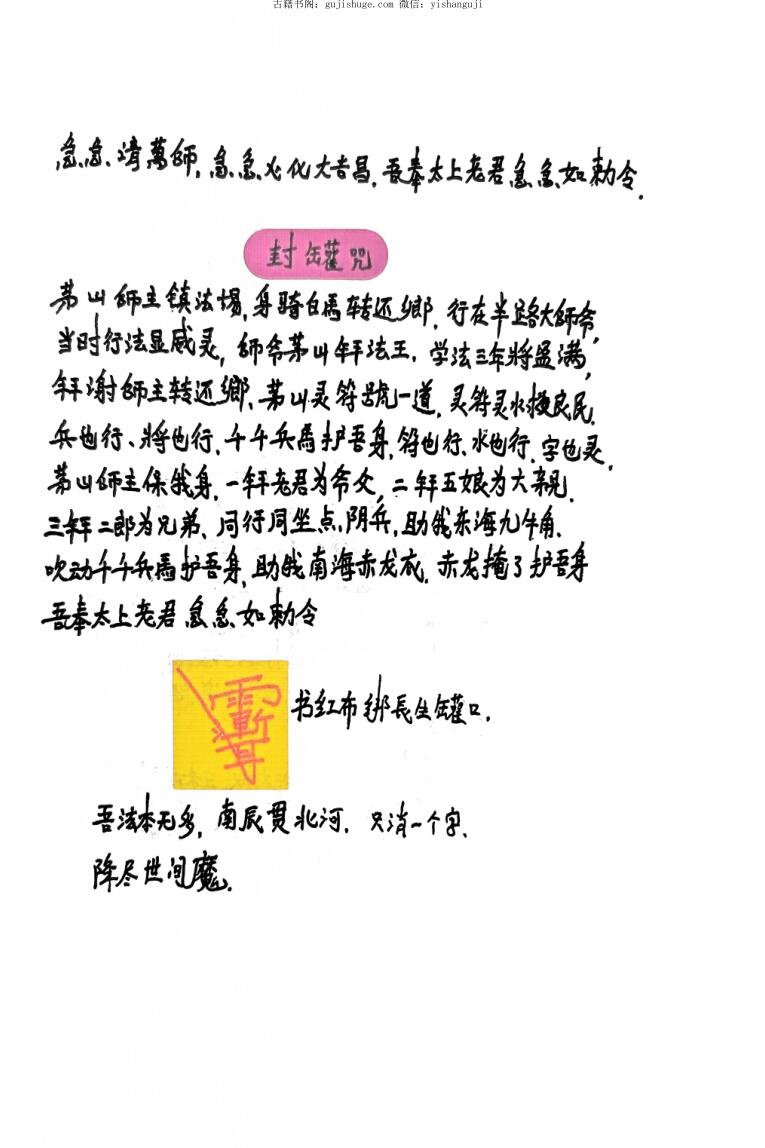 大致内容:坛上祭长生罐、收五方兵护身、烧符咒、封罐咒、解官非灵符、人心神不定灵符、禁邪师符、藏魂塞鬼、藏魂掌、结界护坛法、天医治病符、九龙神水治内外症、家宅破邪符、请兵咒、发兵神咒、护身咒、探元辰宫开路咒、草人改运法、草人担煞法、草人脱身改运用法、制解咒、治大小人水泻法、小儿出惊法、望气练眼法、秘传天罡助力神法、金光咒、求财灵符秘法、隔山照光法、人有病在灶君面前祭、按香火秘、烧影法字讳、弄人家宅、茅山闭解法秘、太乙灵针法(治恶)针刺鸡冠练针、做人形法、从冲魂符、封百口、太阳照身法、茅山起钉法、金钟罩身法、送鬼缠身秘法、送鬼符、送病远走法、放杀断血路法(制恶)、隔山种豆(方圆五里内可放)、解法咒、隔山返邪打(邪法邪术放来转回自身)、太阳翻邪解法(解新日一切邪术)、解邪气水法、茅山拍背相合法、大神催婚用、治癫邪鬼怪符、弄死人作怪法、解亡灵法、印药法治病、收鬼水碗、弄人香炉法(压坛,全家都不好)、拦鬼讳、当天请师、隔山打、反符神打(选隔750米都可以打得到)、千斤五雷打、祖师案前求法求道、保护身体秘符、霹邪灵符、茅山治邪神、茅山咒、法坛百事显应用诀、玉皇三道禁邪符保平安、治瘟邪腹痛、解前生冤业、喷水治邪法、放生积福、太上老君勅除百病不进身符水、劝老婆回家用、勅茶法(退疾平安、退急煞)、避盗符、拘贼神咒、保家五方符、到女人家中迷情咒、合情法、男女朋友多言口舌吵闹用、请神咒(止病不恶化用)、玉皇通天地秘诀、改人性情秘法、整人不顺法、阎王差鬼叫门法、弄人惊吓法(小儿哭闹)、救生灵秘、打影法(伤人惩恶)、开婚拆情用(鸡头降)、弄人开店铺生意不好、闭人家烟火法、房内镇鬼法、吃食东西防传染疾病、观音救罪解牢狱法、铁拐李冷坛秘法(使别人坛不好,不灵、不应)、仙索缚邪咒法、病重阎王案前关魂锁黄泉路法、茅山运金光练气合神法、关圣帝君驱邪治病水(一次见效、虚邪实病)、药王保身避病诀、求仙方治百病法、弄人病法(附解法)、日夜狼虎吃人法、茆山小鬼术、虎山灯水避急难法、黑煞神咒、虎山避寒诀、蓬莱仙丹咒枣法、请罗汉法咒、蛇咬住痛、罗汉退烧神咒、五雷三昧火、治百病符水、安保家堂平安、破法神咒、治内伤灵符、行山过路遇鬼邪迷路、虎山破暗游冥大法、移喉癰、祈福灯符牌、雪山禁恶毒、收魂