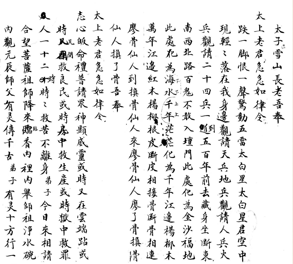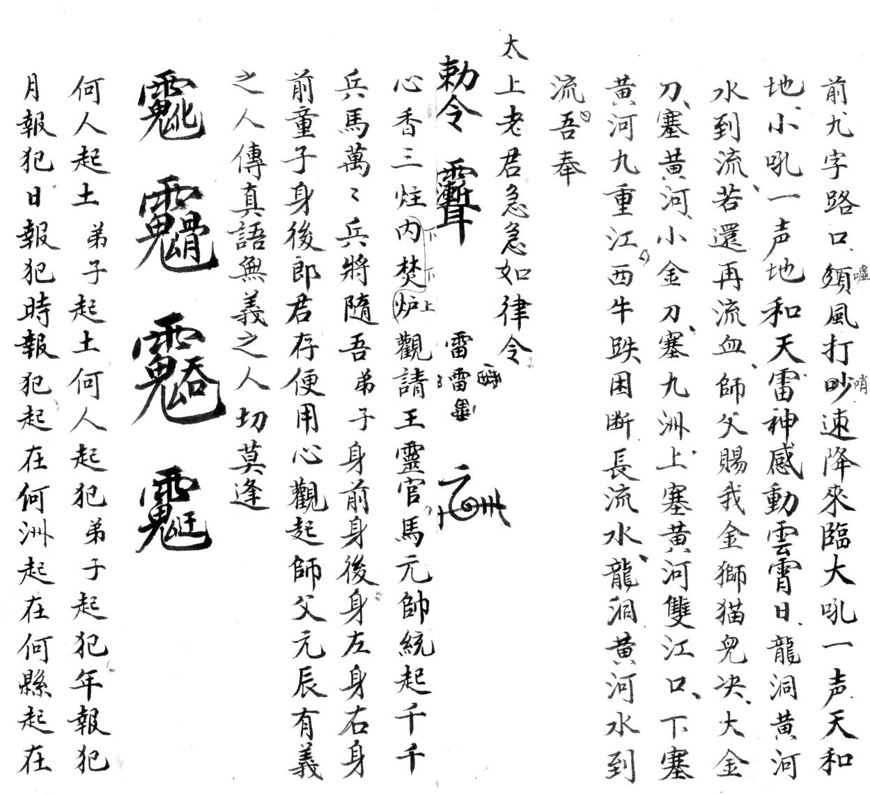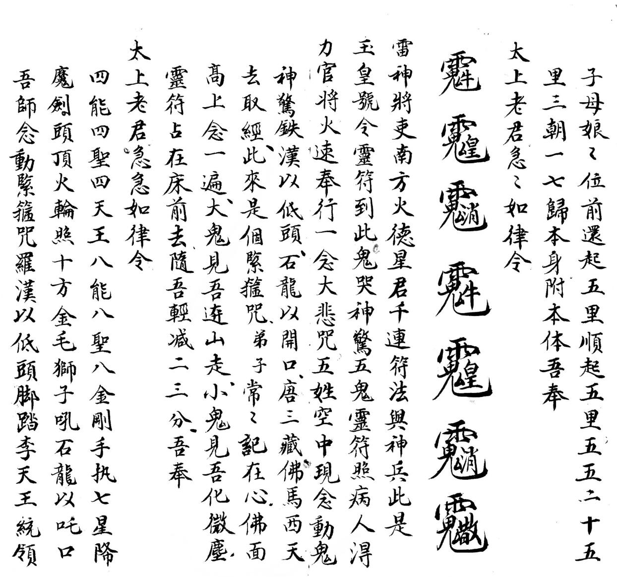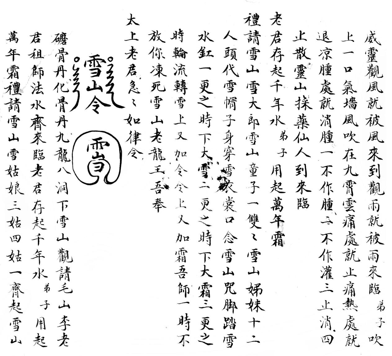 梅山道教秘术《秘授灵书》民国二十六年。内容包含:收水科仪、雪山令、雪山咒、收疮一宗、取魂用卦、普庵神咒、道教大悲咒、六甲章、送阴箭解穢、开天门、土地咒起马钱、化身咒、梅山五雷决、顶敬五猖等。