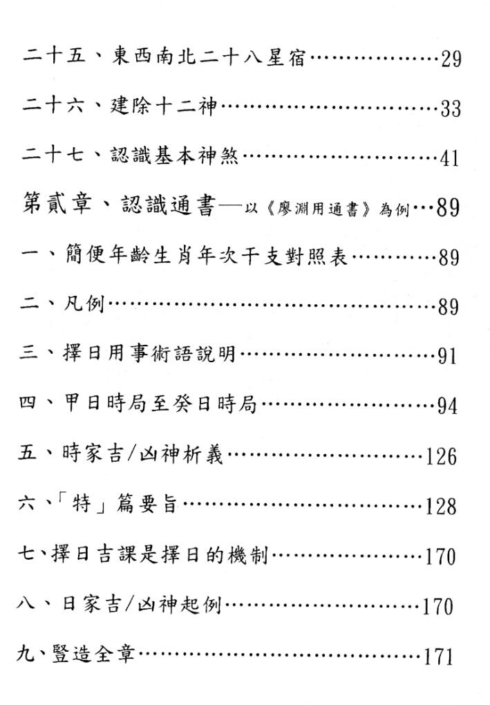 本书之大纲分为五章:第一章,择日学基本知识。第二章,认识通书(以信发堂廖渊用通书为例)。第三章,认识《克择讲义》。第四章,神煞与择日综论。第五章,择日实例演练。本书特点在平实叙述,章节有序,由浅入深,一气呵成。更实用之处是第四章认识神煞,以笔划多寡介绍二百馀神煞,读者按笔划寻找甚为方便,在第五章实例演练,将错综复杂的通书透过固定程序的演练,将理论与实务结合,以上两点创下择日学著作新标竿。