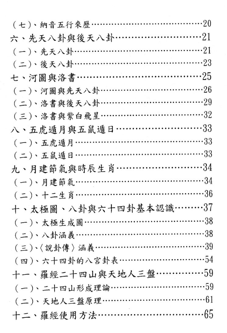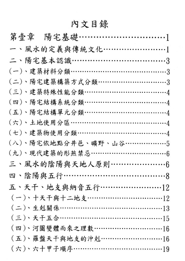 本书开头先用八十余张图片提供各种概念。第一章介绍阳宅的基本功,例如河图、洛书、元运、年命、罗盘原理等。第
