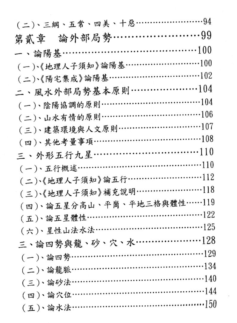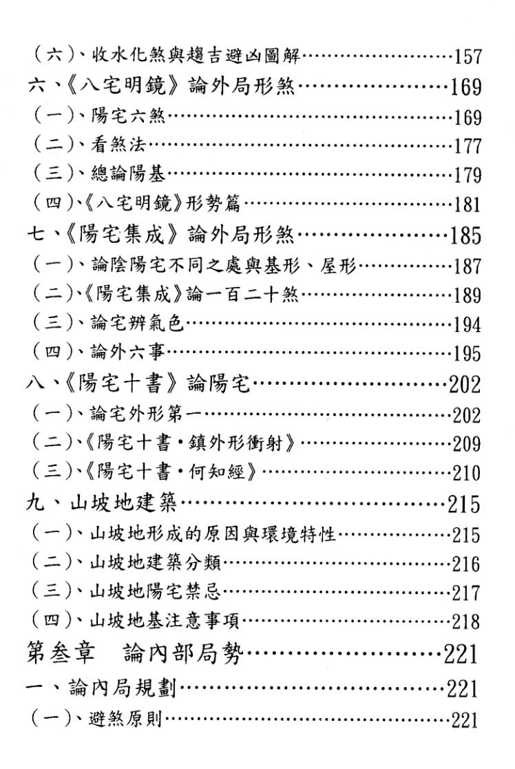 二章论外部局势并以图例辅佐,第三章论内部局势,第四章八宅法理气,第五章紫白飞星法。全由简入繁,但深入浅出。