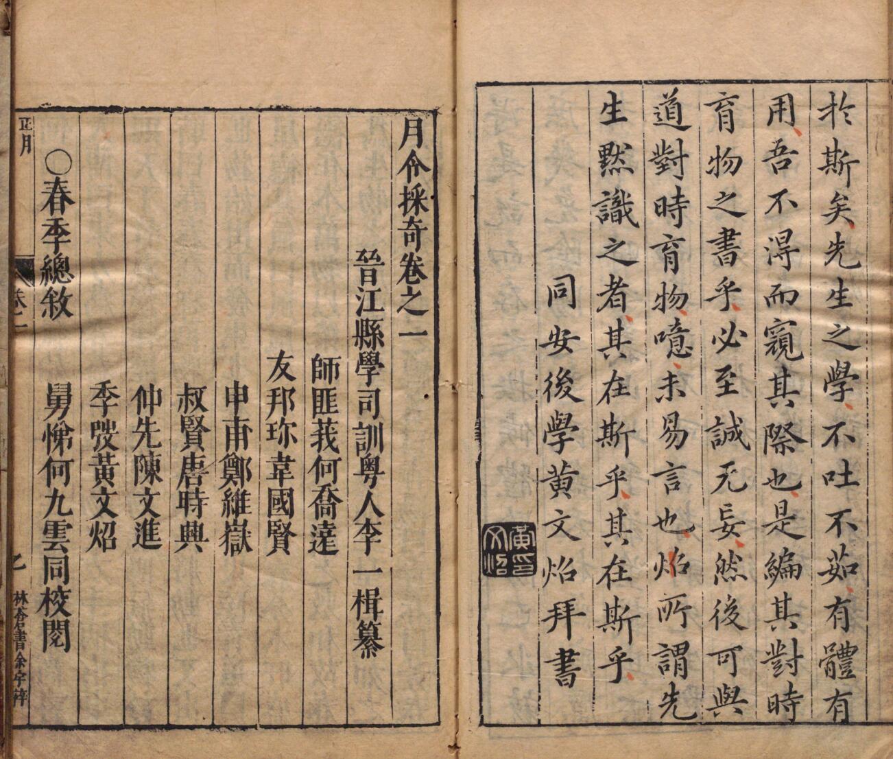 《月令采奇》一书于万历四十七年(1619年)付梓于福建晋江,参与校阅者有闽籍名公何乔远等七人。全书分为四卷,共计约11万字,按“春夏秋冬”四季顺序编排,季有总叙,季分月,月有月令,月分日,日有杂记。内容涵盖二十四节气、节庆民俗、历史掌故、时令养生、中医药和农业占候等多个方面。在编纂形式上,该书大量引用前人以及同时代的有关著作,基本上是“无一事无来历”,同时他在引述材料的基础上进行加工和重述,显得更加精炼和隽永