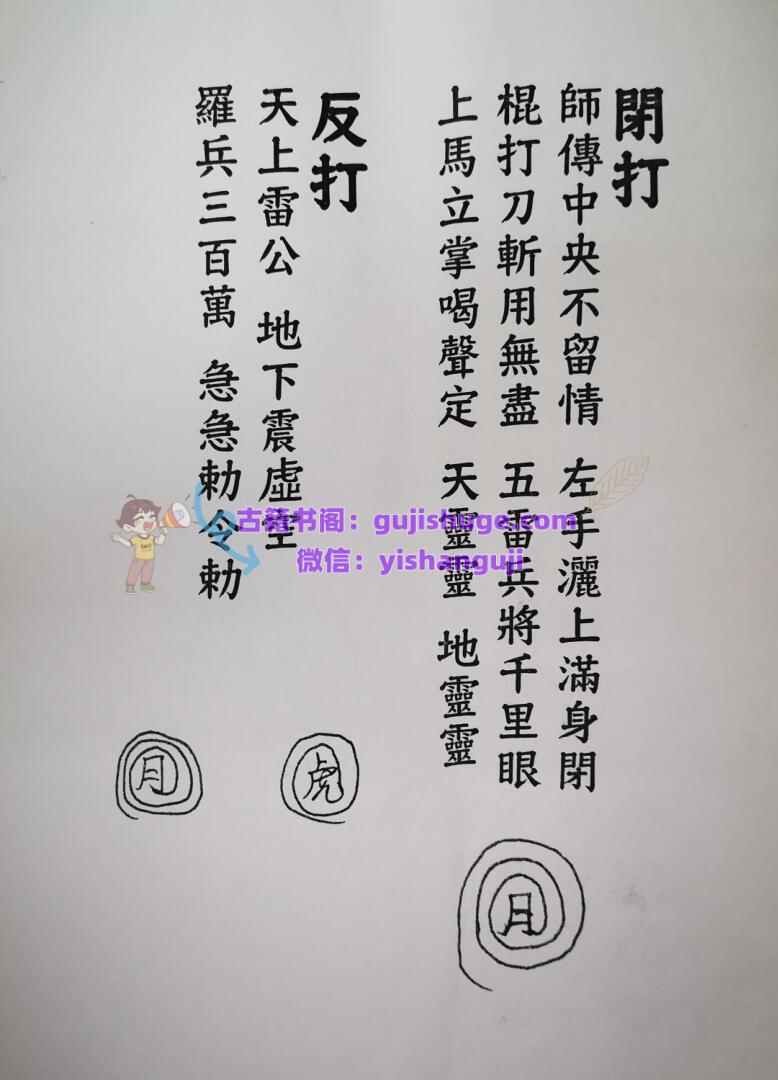 简介:《莫家法府法术》民间秘法相关书籍。内容包含:解降化毒符,五雷神结锤符,总咒,追失物法,小阴箭,大阴箭,闭打,烧关节痛,法脉流行,玉帝护身符,五雷化煞符,反打,打邪,点打,点限打,打鬼,急救止痛止伤,恨打,止血止痛消肿封字令,化骨水,千斤锤,万手争,打筷寄命法,天鹅部斗,老君仙师教,五指山,神打,五雷掌,限打,破法,风罗诀,小儿夜啼用字,打鬼驱邪,金童玉女教,治病灵符,散痛止痛枯疮,七封五雷令,治癫破法,追魂以存六甲用,封枪避弹,赶字鬼,封针,破法开禁,催生符,启师水碗符,寄命,化符在水面食,封刀,放点放记,安胎符,童人开光法,送师咒,显功夫咒,土地咒,三十六道金玉符。