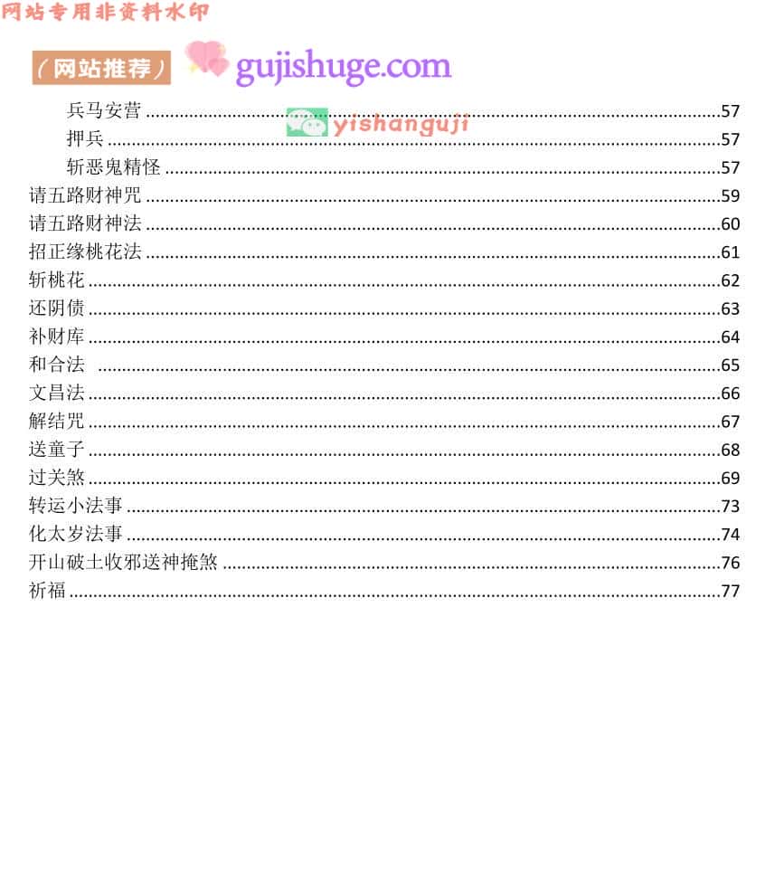兵马安营, 押兵,斩恶鬼精怪,请五路财神咒,请五路财神法,招正缘桃花法,斩桃花,还阴债,补财库,和合法,文昌法,解结咒,送童子,过关煞,转运小法事,化太岁法事,开山破土收邪送神掩煞,祈福