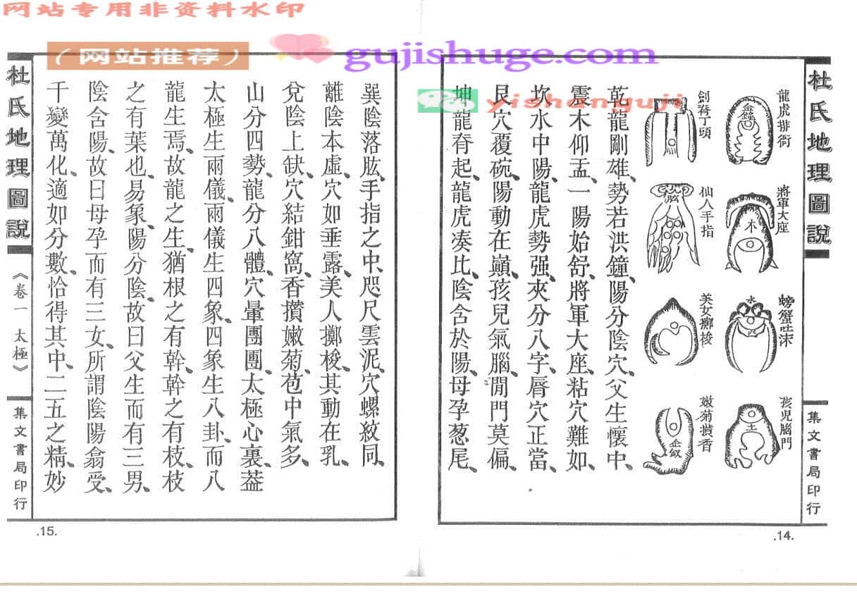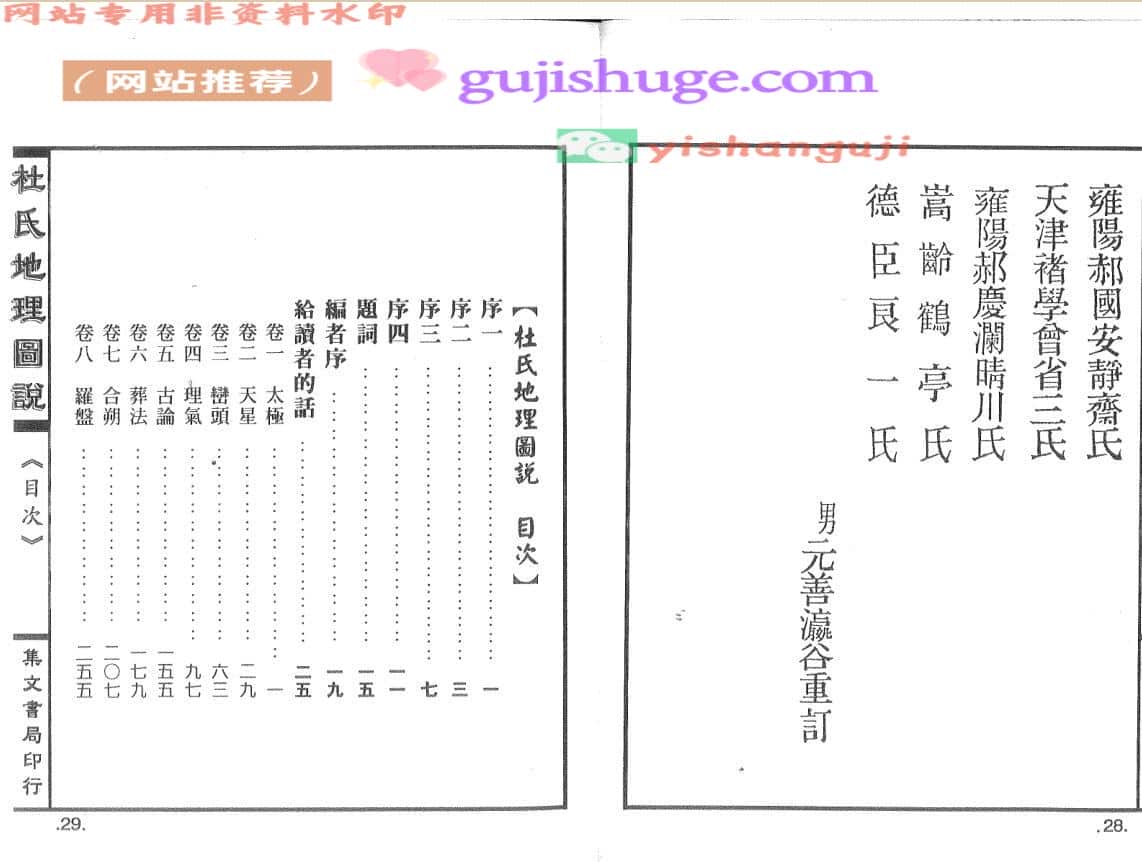 先人之绪论,罔不知鍼芥之 ,因荟萃诸说,并绘图表,勒为一书,日太极,日天星,日峦头,日理气,日古论,日葬法,日何朔,日罗经,综而计之,其类有八,虽于斯道之传,不敢忘议,然半生精力尽在于此,质之同志或有取焉,抑余又闻之,求地以积德为本,执是书以索地者,抑惟积德焉可也。
