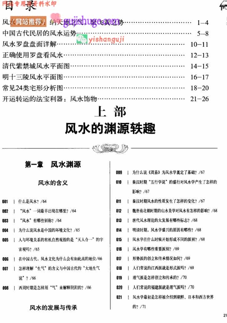风水学,本为相地之术,是用来选择宫殿、村落选址、墓地建设等的方法及原则。风水强调的是人与环境的和谐关系,实际上就是一种中国古代环境文化。在古代,风水是指导衣食住行的一个很重要的因素。本部将从风水在历史发展中的起源与发展过程开始,列举古今风水奇闻轶事及基础风水知识,是读者走进风水世界的必备常识。