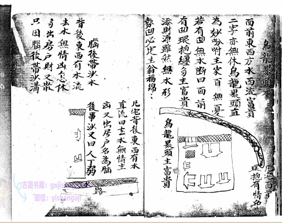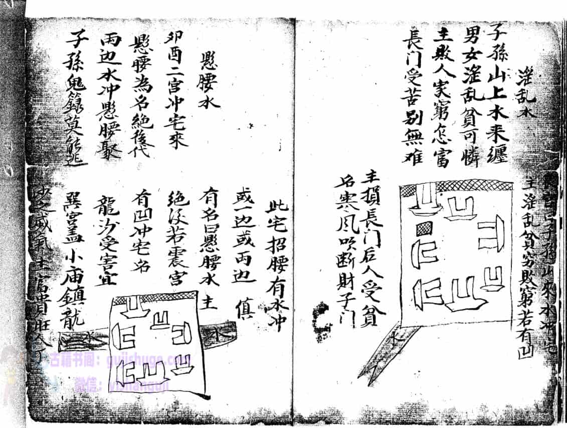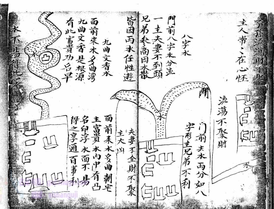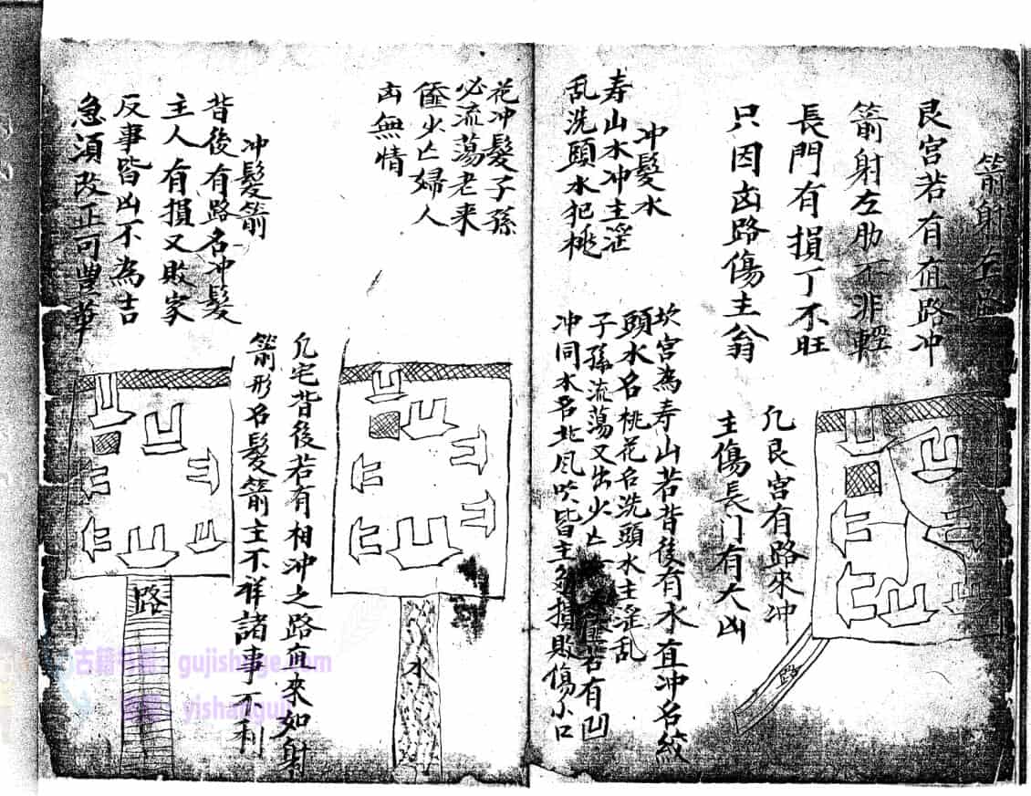 论水方位,凡水来者有吉凶,二十四方各分阴阳子癸丑山属阴以阳论之,艮寅卯乙辰己丙皆为阳…………………论聚水方位,水冲城角图例,箭射左路,阳宅外局断,等等