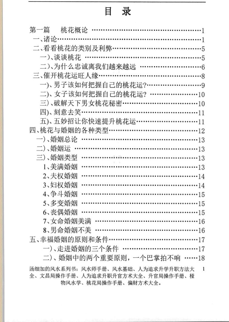 第十三篇:如何化解婆媳关系的风水。第十四篇:桃花与子女。第十五篇桃花与性生活。第十六篇:桃花饮食。第十七篇:桃花风水吉祥物品。第十八篇:如何化解家庭口舌是非。第二十篇:桃花的禁忌(单身和美好家庭的禁忌)。如何化解第三者插足。桃花符、咒、卦和方术及布局操作手册,在另著的桃花副篇中。全书约25万字。470页