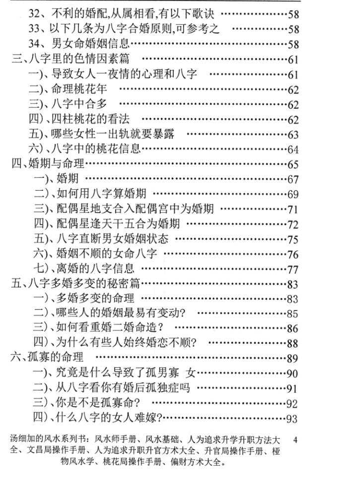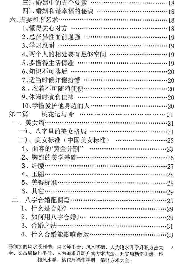 六、幸福婚姻的原则和条件:1、走进婚姻的三个条件;2、婚姻中的两个重要原则,一个巴掌拍不响;3、婚姻中的五个要素;4、婚姻和谐幸福的秘诀;5、婚姻运;6、夫妻和谐艺术。第二篇桃花运与命理的规律及艺:一、浅谈八字预测的社会基础;1、如何用八字合婚?2、为什么合婚能影响运程?3、八字不合的夫妻如何补救?4、什么是配偶星?5、什么是夫妻宮?6、什么是姻缘运?7、什么是合婚?8、什么是桃花入命?9、什么是桃花运?10、子时出生的人命带什么桃花?11、卯时出生的人命带什么桃花?12、午时出生的人命带什么桃花?13、酉时出生的人命带什么桃花?14、什么是咸池星?15、什么是红艳星?16、什么是红鸾星?17、如何根据生肖寻找咸池星?18、咸池星所在地支意味着什么?19、如何根据生肖推算最具桃花运的年份?二、八字里的美女格局。三、八字里的色情因素。四、从八字日支剖析多婚的秘密。五、从你的八字看你的另一半长相。六、从生日看你多少岁桃花最旺。七、鬼谷星推算方法。八、会成为女富豪的八字。九、如何才能知道你哪年能结婚?十、用八字预测自己结婚时间。1、配偶星地支合入配偶宫中为婚期:2、配偶星逢天干五合为婚期:十、看你女朋友是否有泼妇性格30十一、导致女人一夜情的心理和八字。十二、八字与婚配:1、看女命婚缘、情缘、丈夫等2、