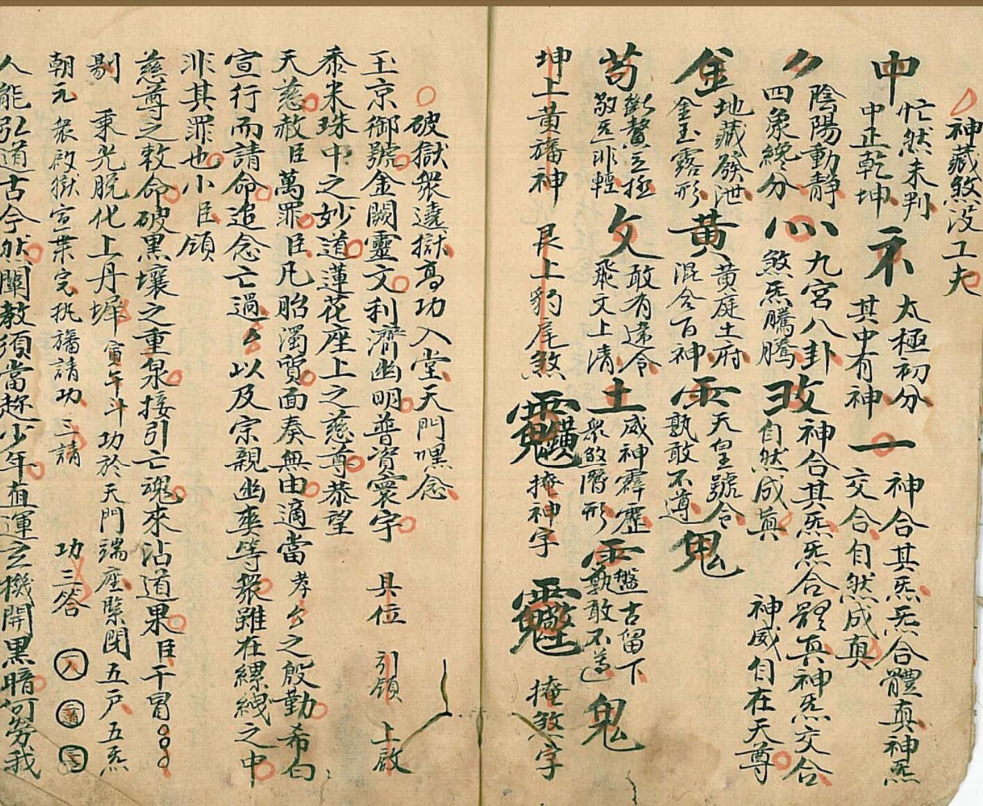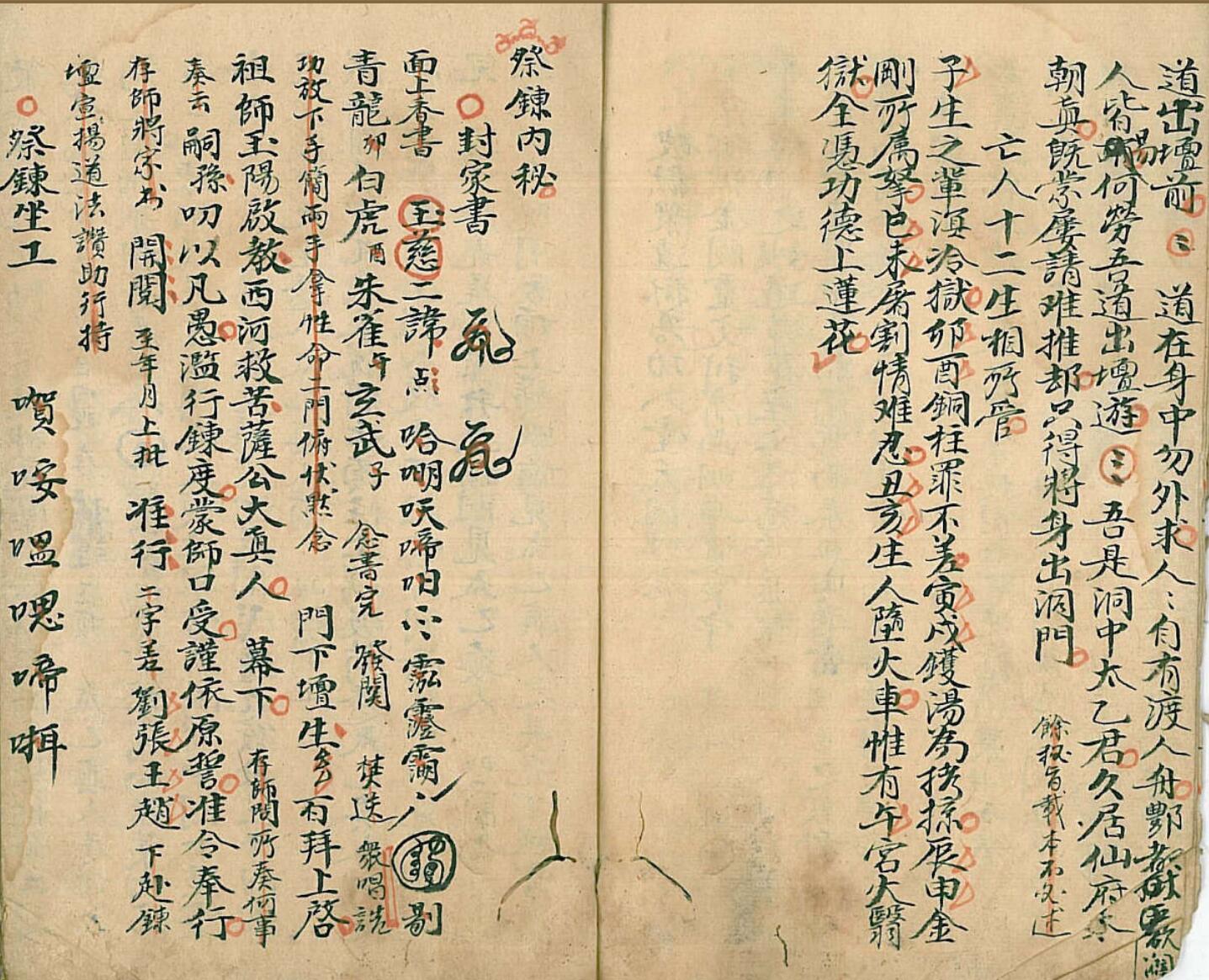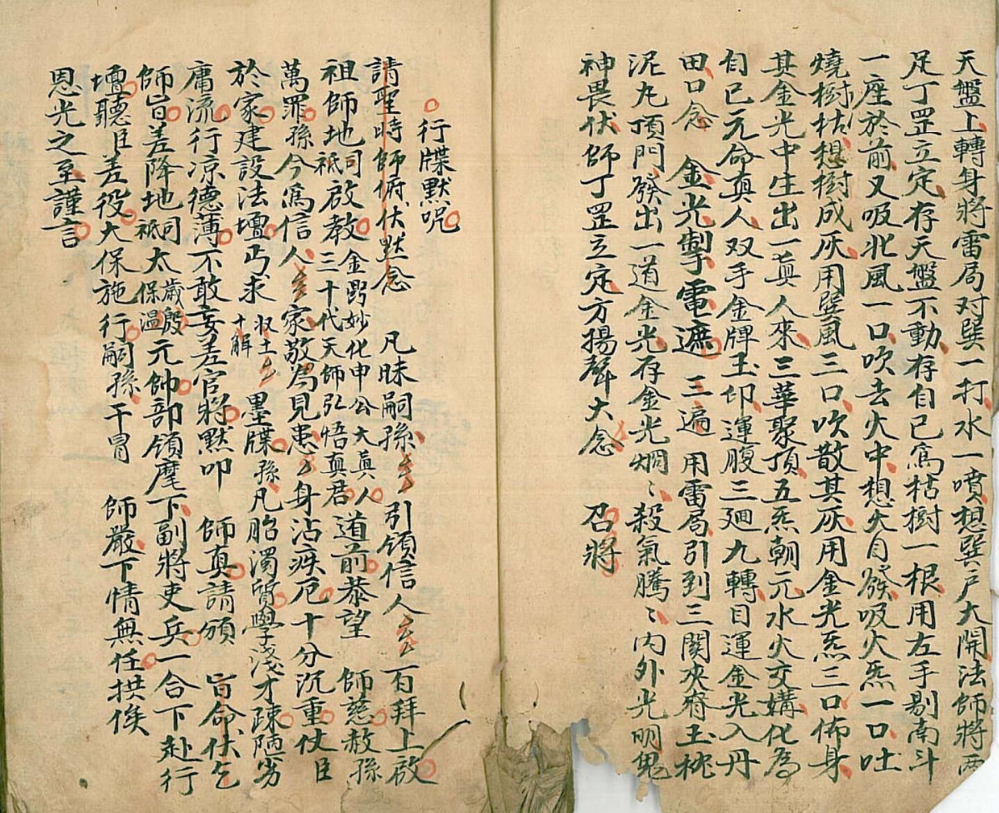 《召将变身秘旨》全书38面共计76页目录:召将变身秘旨、行牒默咒、神藏煞没工夫、祭炼内秘(封家书,祭炼坐工,八门例一看便知,九星起例,九星掌诀图,籙出三山),祭炼秘旨施食同用、祭炼功夫捷径(施食亦同),又施食内旨、论祖炁玄窍、雷霆都司、煞炁论、掐诀论、天罡原流、铅汞之说、衞灵咒、发炉内工……最后一页边角局部有残破,损字。
