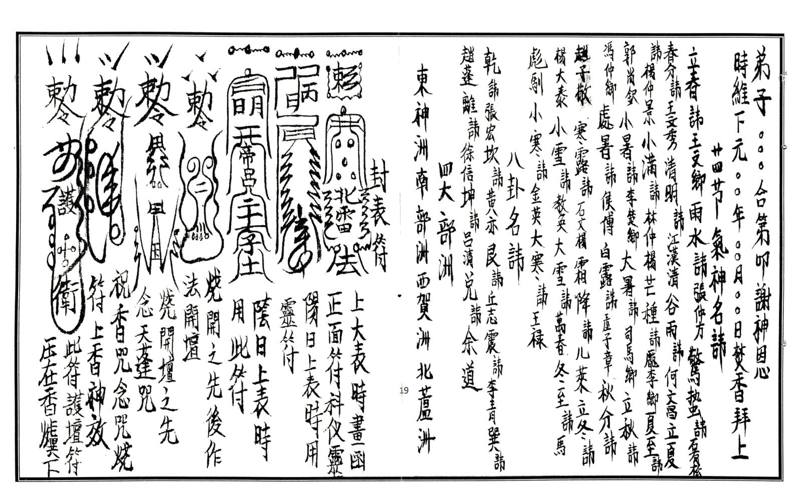 内容有:符咒法术的由来、书符要诀、诵咒要诀、画符十戒、诵咒灵机、诵咒姿势、画符筆顺、除邪咒、除邪符、画符用纸、画符用色、吞符要诀、焚符要诀、埋符要诀、佩符要诀、法印使用归类、净心神咒、净身神咒、净天地神咒、祝香咒、金光神咒、净宅科仪等等。