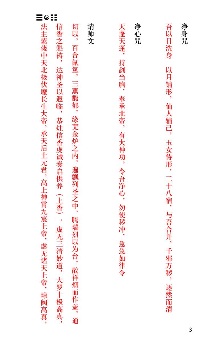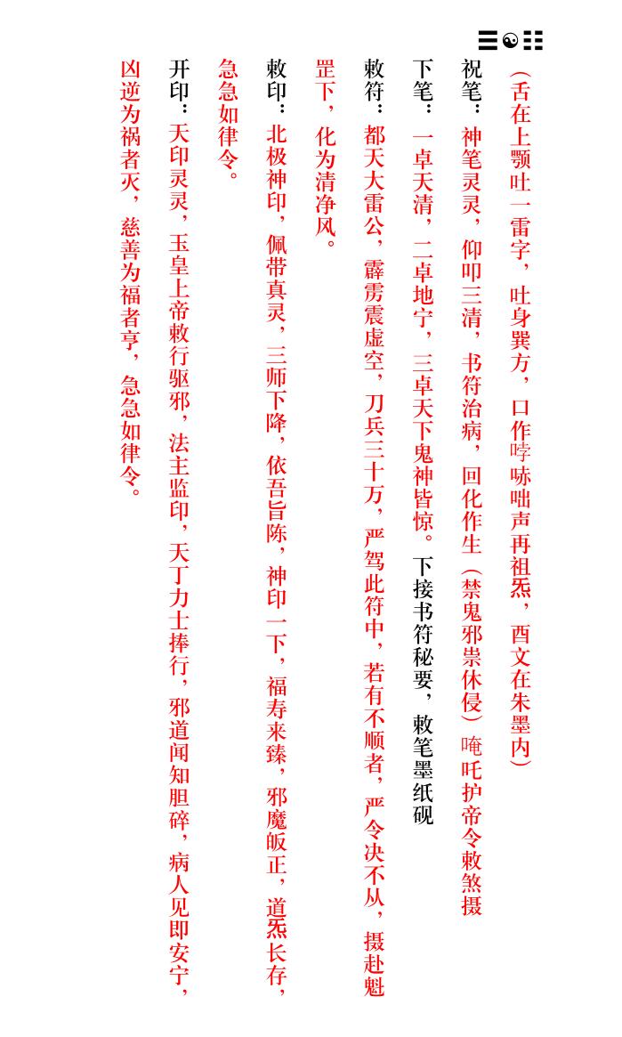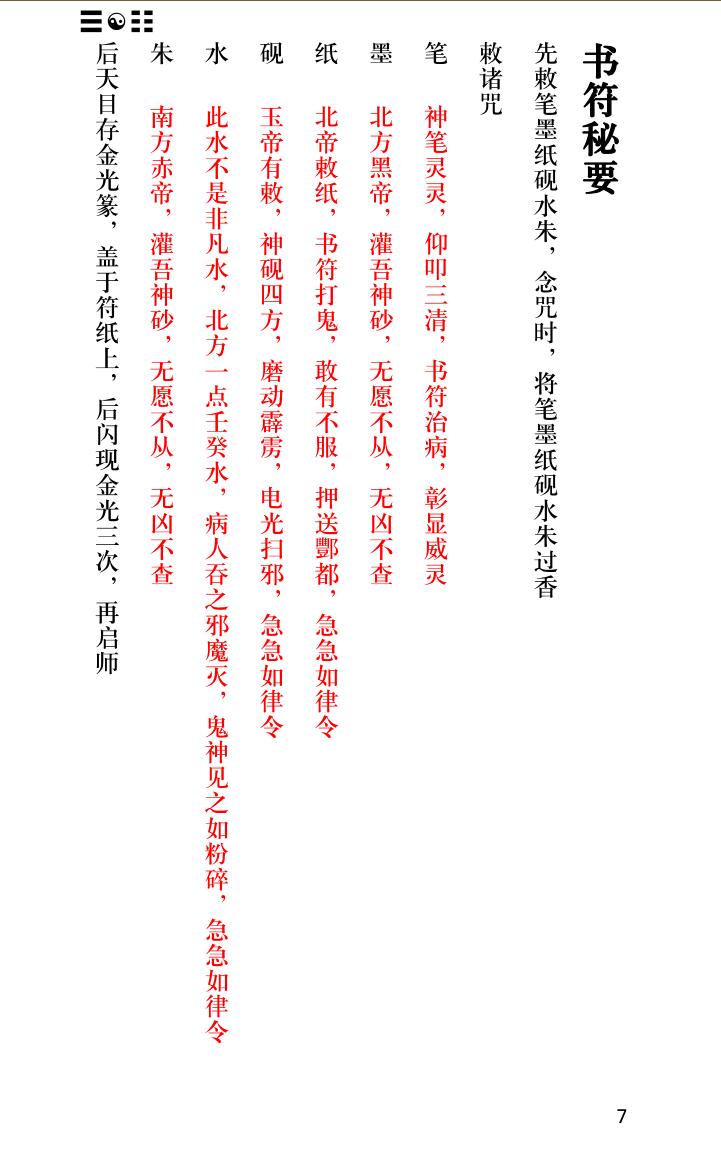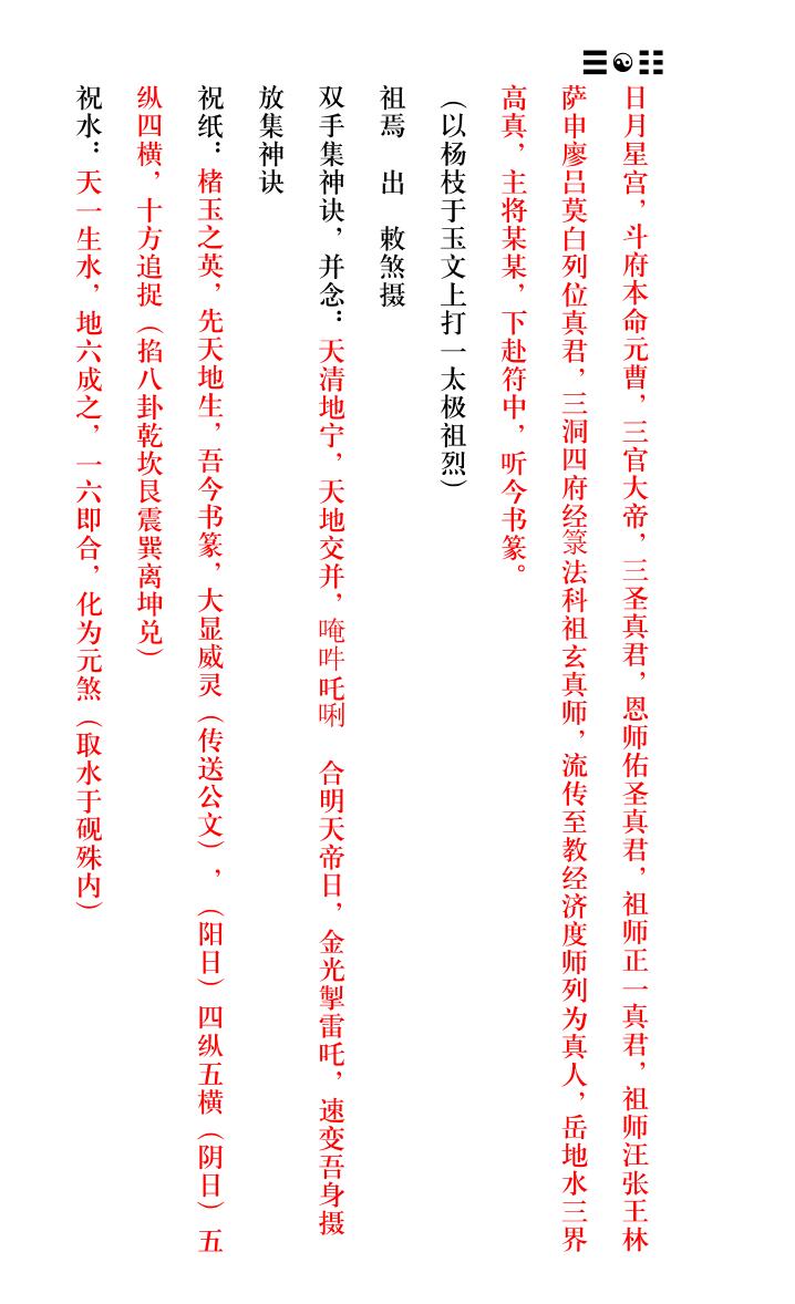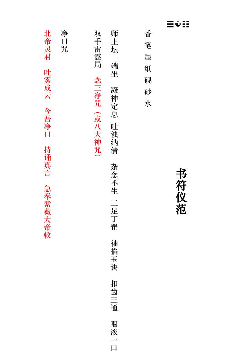 内容有:书符仪范、香笔墨纸砚动、砂水、袖掐玉诀、咽液一口、师上坛端坐、凝神定息 吐浊纳清、杂念不生二足丁罡、扣齿三通、双手雷霆局、念三净咒(或八大神咒)、净口咒、今吾净口 持诵真言、北帝灵君吐雾成云、急奉紫薇大帝敕等等。