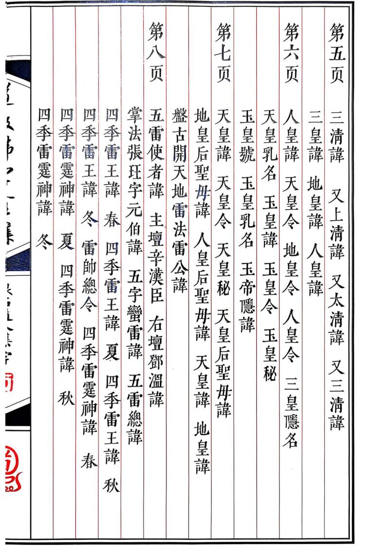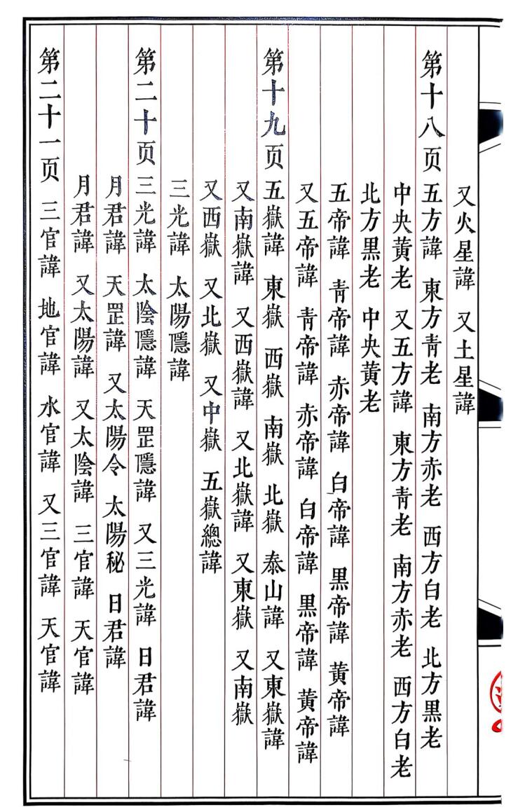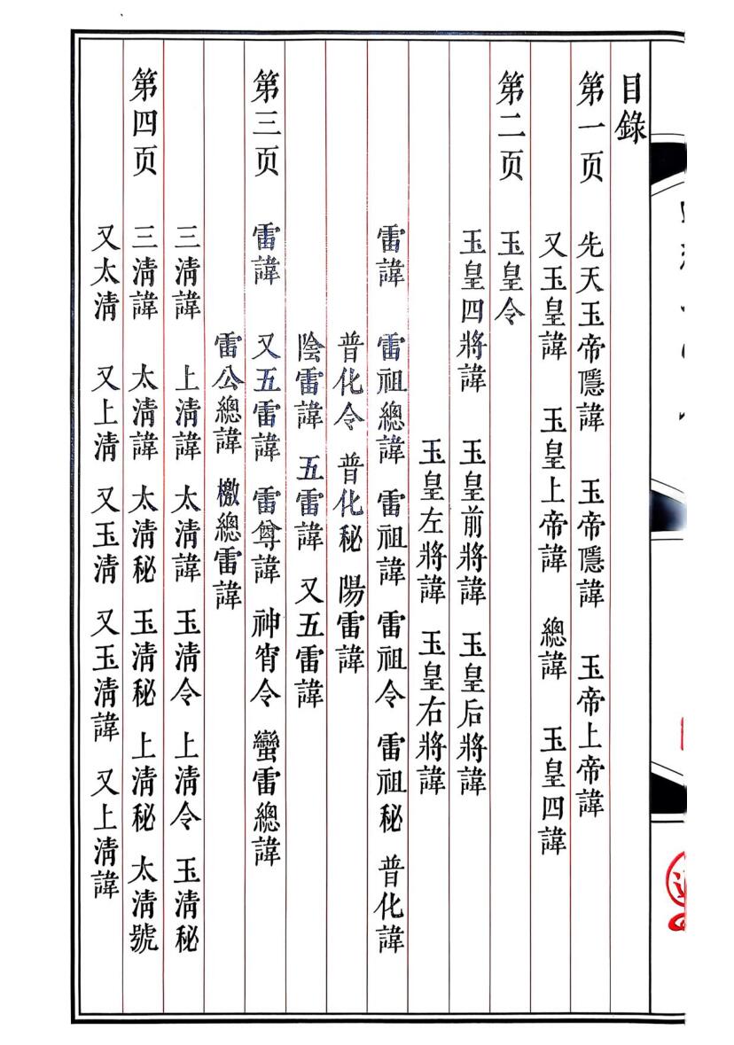 内容包括:先天玉帝隐讳,玉皇上帝讳,玉皇四讳,雷讳,雷祖总讳,三清讳,上清讳,太清讳,玉清讳,人皇讳,天皇讳,地皇讳,五雷使者讳,四季雷王讳,四季雷霆神讳,蛮雷总令,五方雷公讳,天罡号,天罡母讳,四圣讳,紫微讳,紫微父讳,北斗七星讳,南斗六秘,四曜星讳,五岳讳,三光讳,三官讳,虚靖天帅讳,救苦天尊讳,五帝星君讳,元阳讳,元阳令,铁帅令,鲁班讳,真武讳,九凤讳,九天玄女讳,真武讳,酆都讳,四大天王讳,火铃将军讳,辛君四字真言,王帅铁雷关号,王帅拷鬼治病法名,玄坛响报秘号,关君金书八团锦秘等。