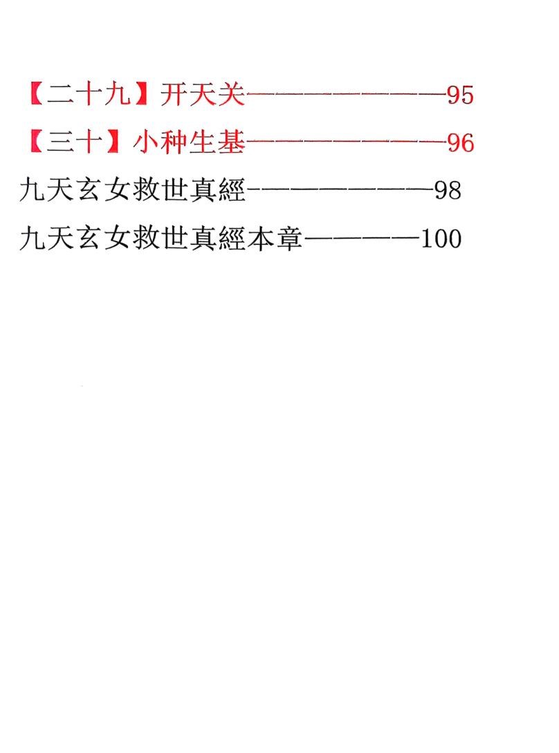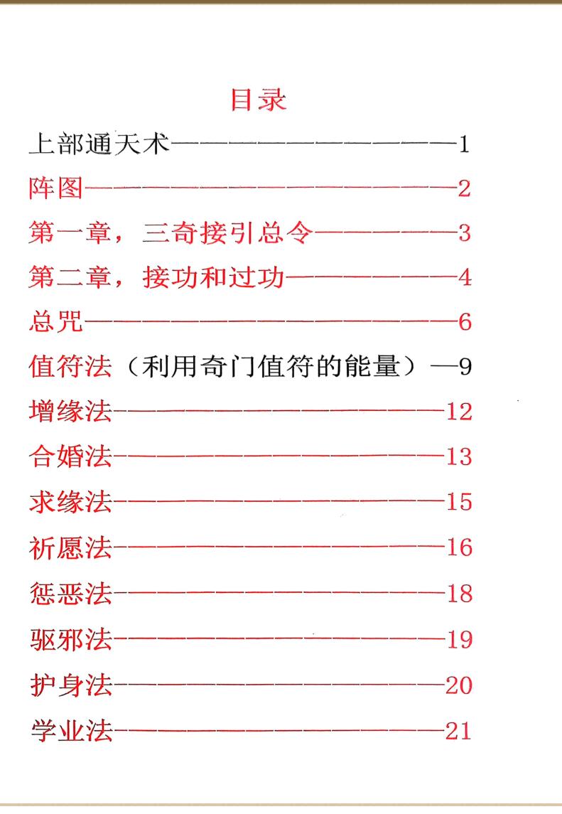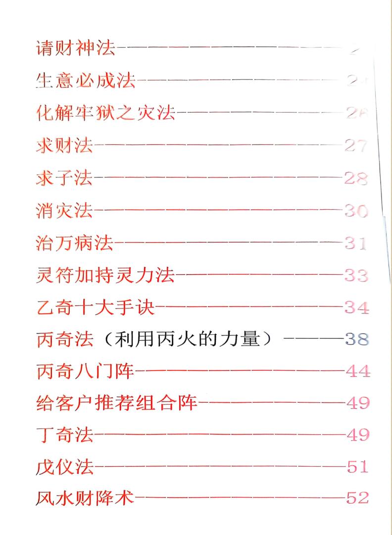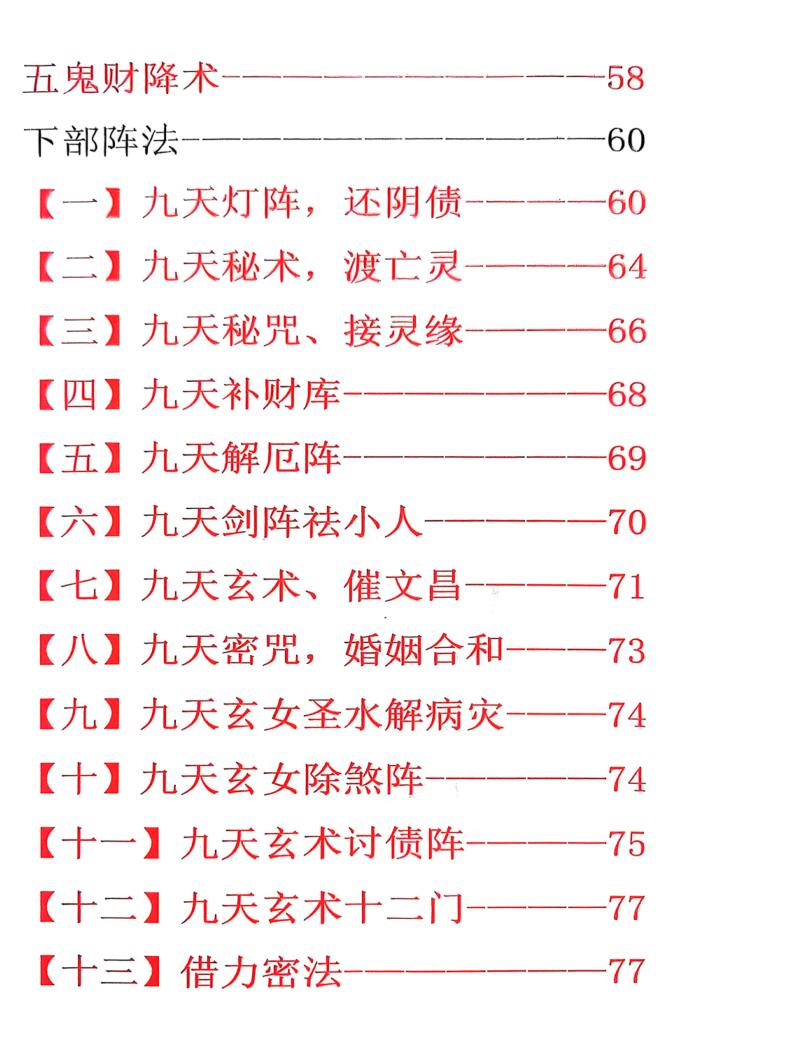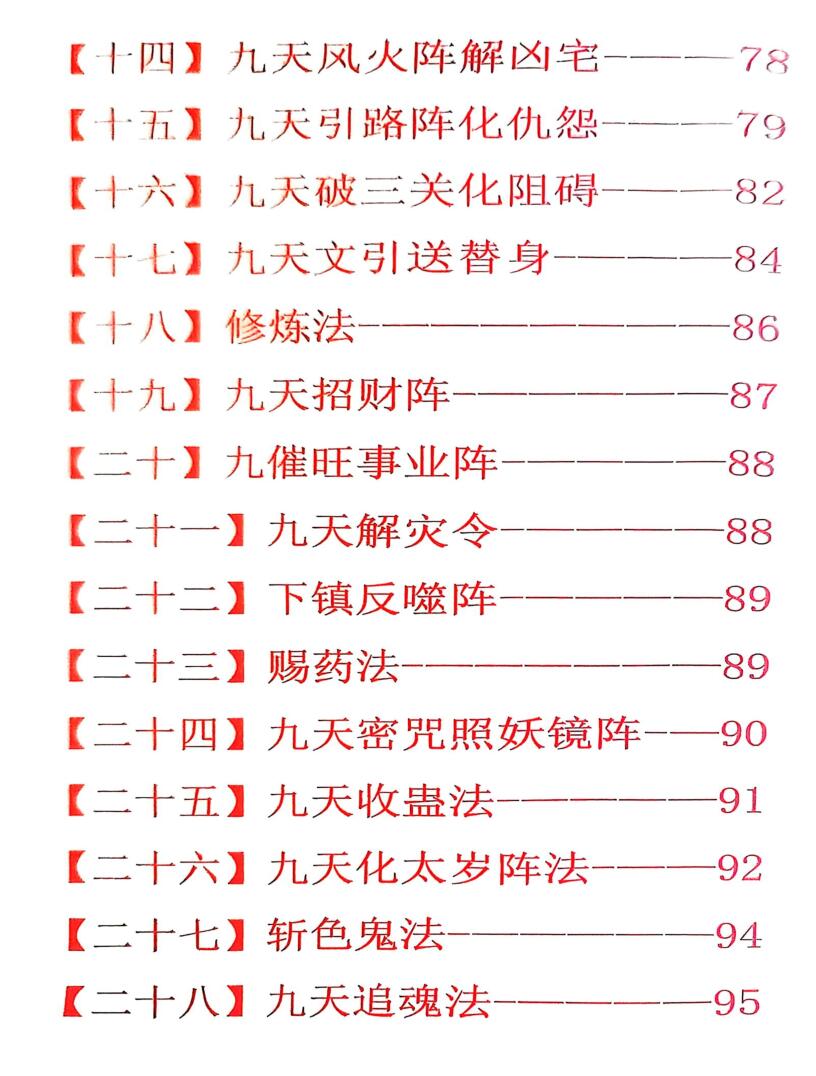 内容有:值符法(利用奇门值符的能量)、增缘法、合婚法、求缘法、祈愿法、驱邪法、护身法、学业法、请财神法、生意必成法、化解牢狱之灾法、求财法、求子法、消灾法、治万病法、灵符加持灵力法、五鬼财降术、九天灯阵、还阴债、九天秘术、九天秘咒、接灵缘、九天补财库、九天解厄阵、九天玄术、催文昌、婚姻合和、九天玄女圣水解病灾、九天玄女除煞阵、九天玄术讨债阵等等。