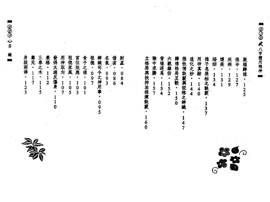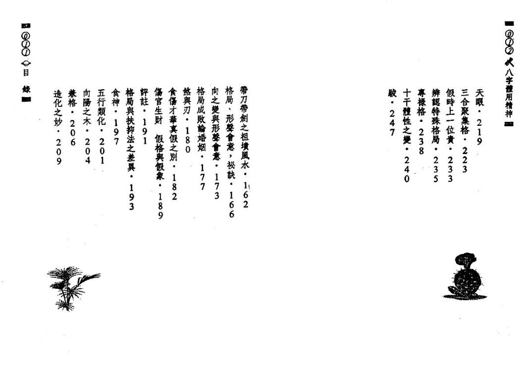 目錄 自序 日祿歸時格 臨山水之木 返魂 祿之真假 宮位重現 月時夾身 乙丑柱之性 續命 祿神 六親 司令之神 假正官格 闢謬 飛天祿馬 地理