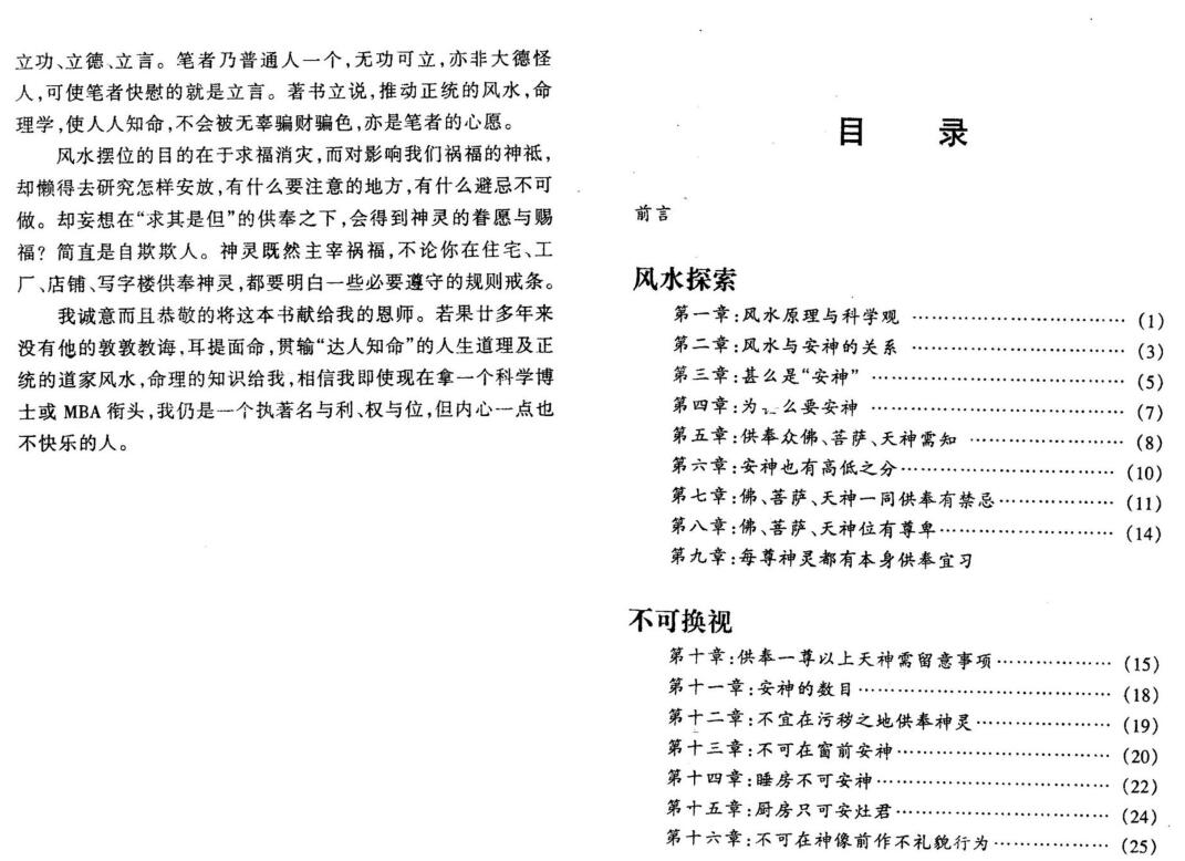 本书有几个目标:一是填补历代风水学探究“安神”这环节之不足的真空区,使同道者有-本书去依据,二来可使普罗大众在改善风水时,不论在家宅,生意商宅上,都有一盏明灯去指示,不会被一-些不学无术,滥竽充数的风水先生所欺骗而受损失;此外,笔得研究风水命理学已有二十余年,古人有谓三不朽:立功、立德、立言。笔者乃普通人一个,无功可立,亦非大德怪人,可使笔者快慰的就是立言。著书立说,推动正统的风水,命.理学,使人人知命,不会被无辜骗财骗色,亦是笔者的心愿。