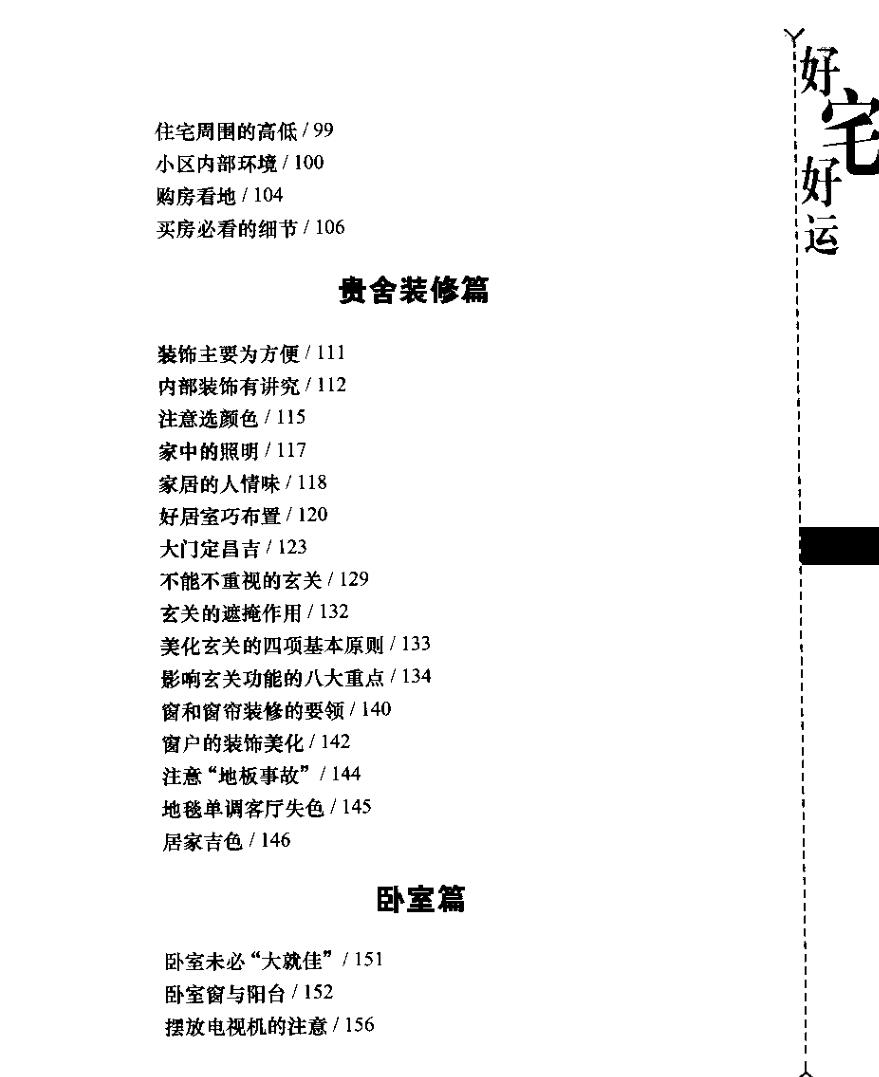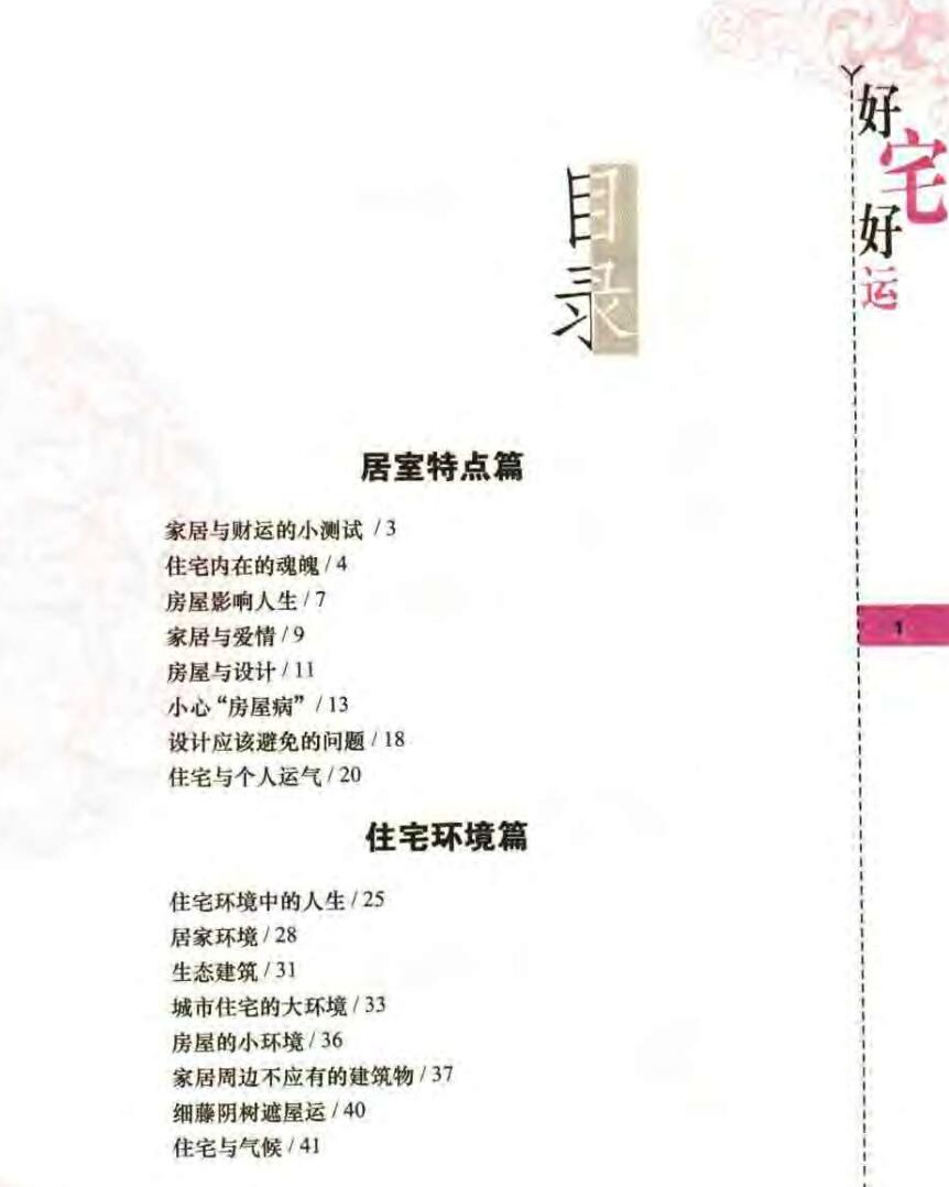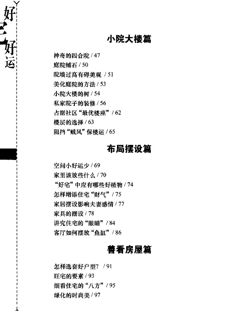 本书介绍了住宅与风水的一些知识,包括居室特点篇、住宅环境篇、小院大楼篇、布局摆设篇、善看房屋篇、贵舍装修篇、卧室篇、客厅书房篇、厨卫篇。