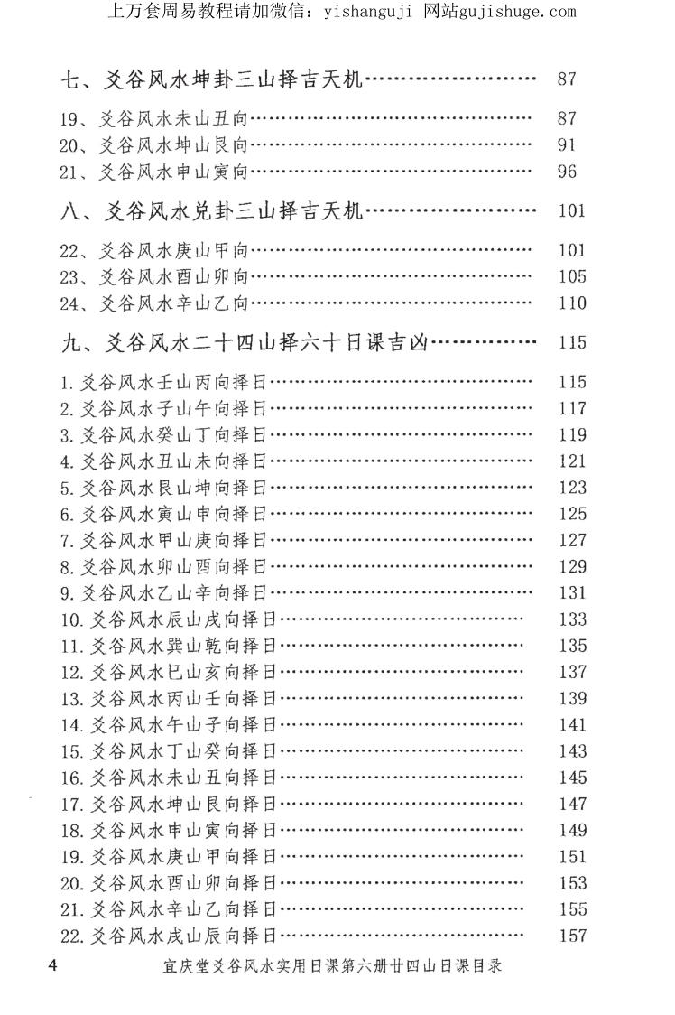 宜庆堂《义谷风水实用日课》是本人参照《协纪辩方书》、《玉匣记》、《董公择日法》、《克择讲义》、《选择求真》、各种《通书》、玄空大卦、三元三合、斗首、奇门、二十八宿、九星选择日要览等有关日课的书汇集篇成《爻谷风水实用日课》。此书通俗易懂,查找日课简单,方便普通百姓求吉避凶选择吉日子的书。《义谷风水实用日课》共分六册,第一册通用日课,是最常用的;第二册用事日课,是分类专用日课;第三册阳宅日课,是做房屋和修造等日课;第四册阴宅日课,是做白事、阴地用日课;第五册风水日课,是做风水常用的日课;第六册廿四山日课,做风水二十四山参照选课。