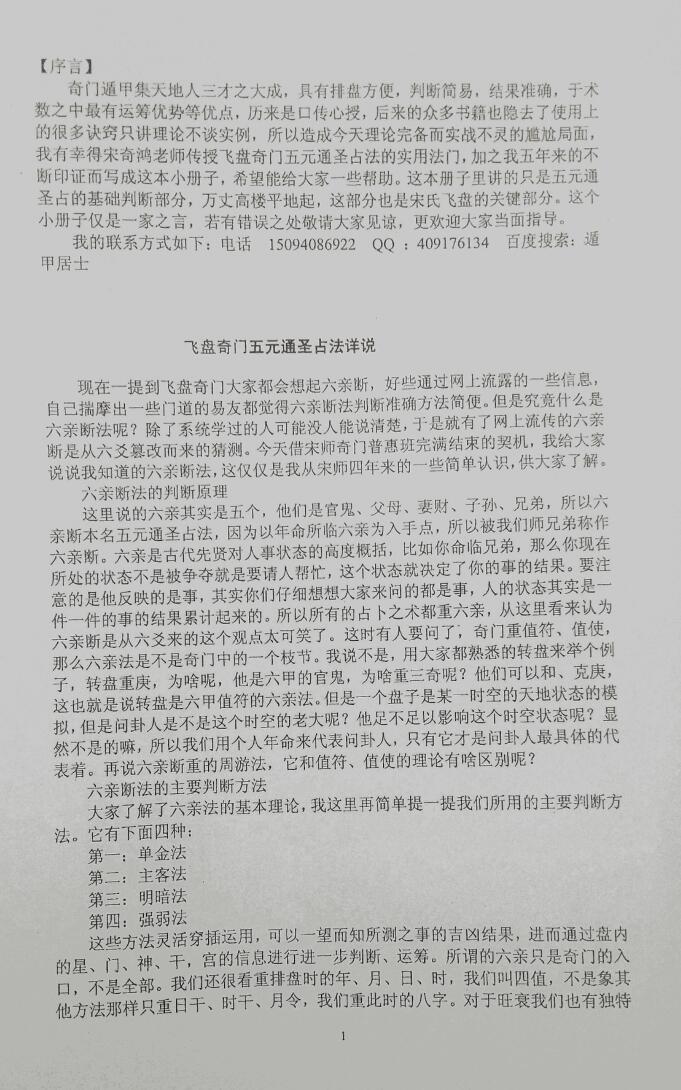 奇门遁甲集天地人三才之大成,具有排盘方便,判断简易,结果准确,于术数之中最有运筹优势等优点,历来是口传心授,后来的众多书籍也隐去了使用上的很多诀窍只讲理论不谈实例,所以造成今天理论完备而实战不灵的尴尬局面,我有幸得宋奇鸿老师传授飞盘奇门五元通圣占法的实用法门,加之我五年来的不断印证而写成这本小册子,希望能给大家一些帮助。这本册子里讲的只是五元通圣占的基础判断部分,万丈高楼平地起,这部分也是宋氏飞盘的关键部分。这个小册子仅是一家之言,若有错误之处敬请大家见谅,更欢迎大家当面指导。