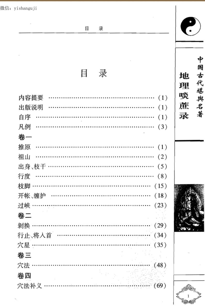 《地理啖蔗录》是由清朝乾隆年间著名的风水学大师袁守定编撰。书中广录博辑,旁征博引,用各种例证,从阴阳五行与龙脉的关系、龙脉各穴的形状及其扦葬后的吉凶等方面论述了堪舆风水原理,是堪舆“形派”中的理论和实践完美结合的集大成之作。“啖蔗”就是“吃甘蔗”,作者认为,研习地理堪舆之术,就如同吃甘蔗一样,虽然开始吃的时候可能有些艰难,但是越嚼越甜,越学越有味。《地理啖蔗录》图文并茂,简明实用,是学习风水堪舆的入门必读教材。《地理啖蔗录》共分八卷:第一卷主要讲龙脉探源。第二卷主要讲龙脉的剥换行止。第三卷主要讲寻找穴的方法和穴与龙脉的关系。第四卷主要是增补穴与龙脉的细节解释及扦穴的具体方法。第五卷前面部分着重讲怎样认识青龙、白虎,后面部分讲如何分辨案山、朝山的远近关系。第六卷主要讲论水法、明堂和官星、鬼星、禽星、曜星。第七卷主要讲相平阳之穴的方法,后面讲相土、望气、论水。第八卷分为两部分,第一是杂说部分,第二是闻谈部分。杂说部分的内容包含了方方面面,其中有些是对前面七卷内容的补注。闻谈部分中的内容是作者在学习风水堪舆过程中的所见所闻,也可以说是作者的心得体会和经验总结。