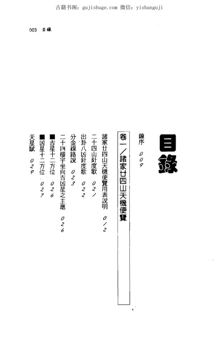 卷一曰(诸家廿四山天机便览):以表明列二十四山下卦?替卦周天度数、玄空挨星格局、先天六十四卦抽爻换象与要诀、廿四吉凶星、十二将星、福德诀、