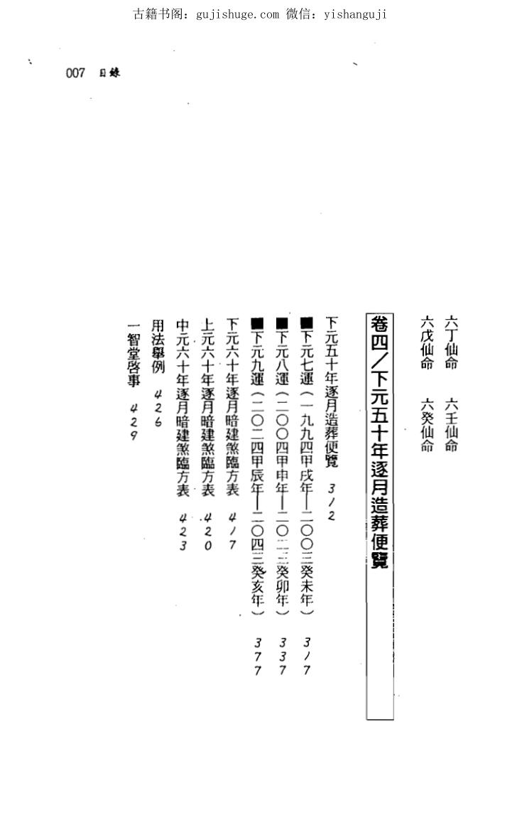 卷四曰(下元五十年逐月造葬便览):以表格明列西元一九九四甲戌年至二○四三癸亥年,五十年间各月份造葬所须避免的三合、三元凶煞,卷末附三元一百八十年各月份(暗建煞)所临方位。备此一卷, 读者可避选择真正之凶煞。