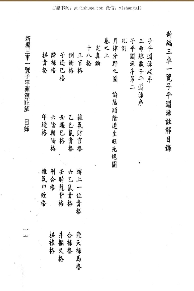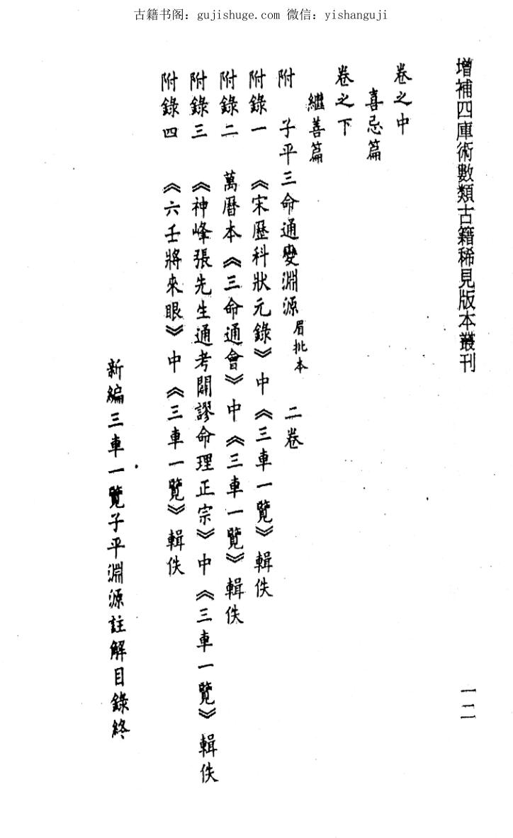 一卷。《子平三命渊源注》一书暂未得见。查阅目前收集到的二十余本命代命理古籍,其中对《喜忌》《继善》注解多达八九家,除吕氏注解外,虽文字多有不同,但意思大致相近,惟吕氏注解中除引用少量徐氏旧注外,其所引前代诸家注解,与目前所见其他诸家注解多有不同,《子平三命渊源注》疑应部分或全部被吕氏收入《新编三车一览子平渊源注解》一书之中。