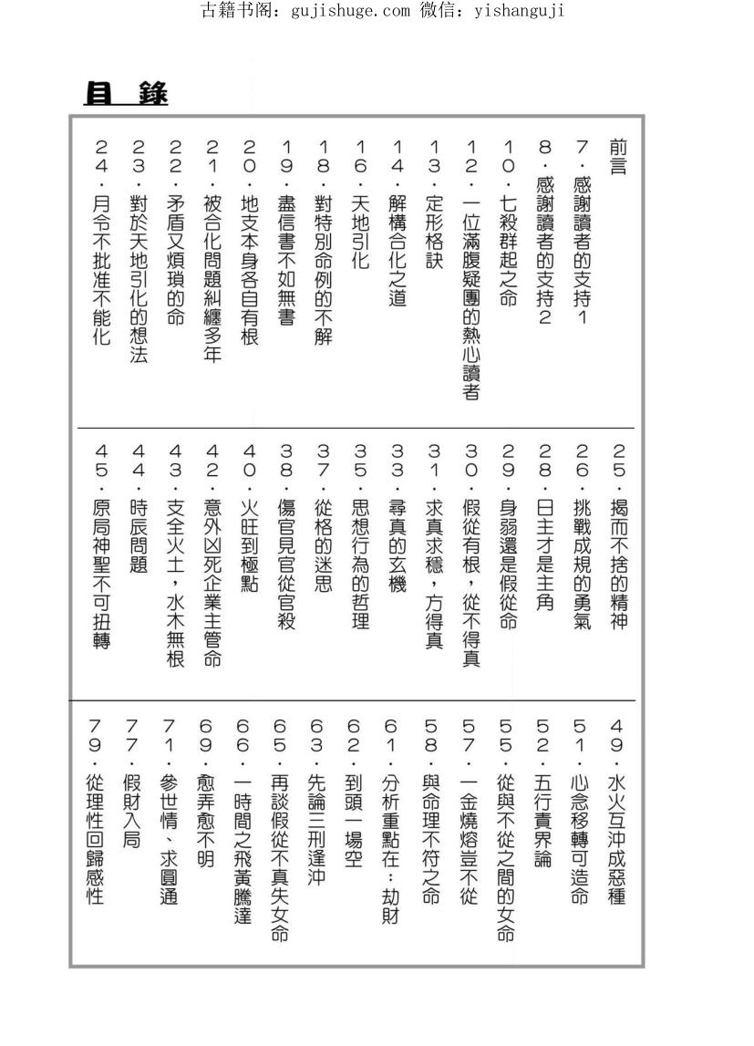 这部著作相信会满足到一些对八字已有一定根底的读者,至于初学者可能会觉得深一些,但也不打紧,只要抱著学术开发的心态,就算一时间未能明解,但始终也会有通晓的一天,到时大家的推命功力已是再上一层楼了。