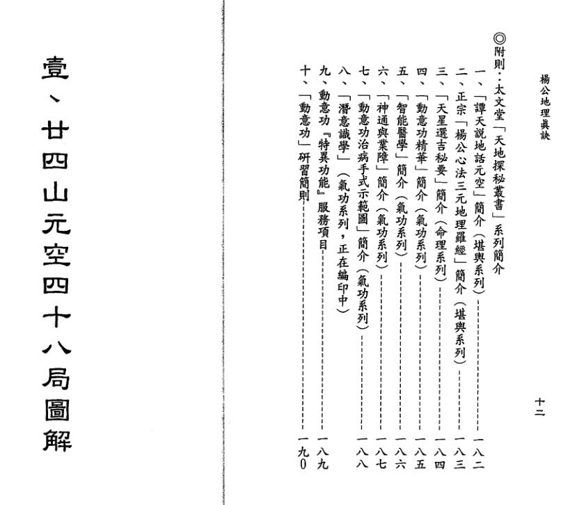 」一书之后,又一公开杨公青囊立局要诀之作。书中尽以图表将如何来龙、如 何立局、如何收来水以及如何立水口等真传实诀,按照廿四山头来龙之顺逆, 立成四十八局,坊间向无传刻,有缘读者若能再根据笔者亲自监制之「杨公三 元地理心法罗经」︵按:该罗经已由太文堂出版社出品︶对照而将六十四卦三 百八十四爻镶入取用,必能符合杨公之「天机妙诀本不同,八卦只有一卦通」 以及「乾坤良巽缠何位,星辰流转要相通」这两句口诀,如此,才能看书了然 ,而不致于登山茫然又愕然!