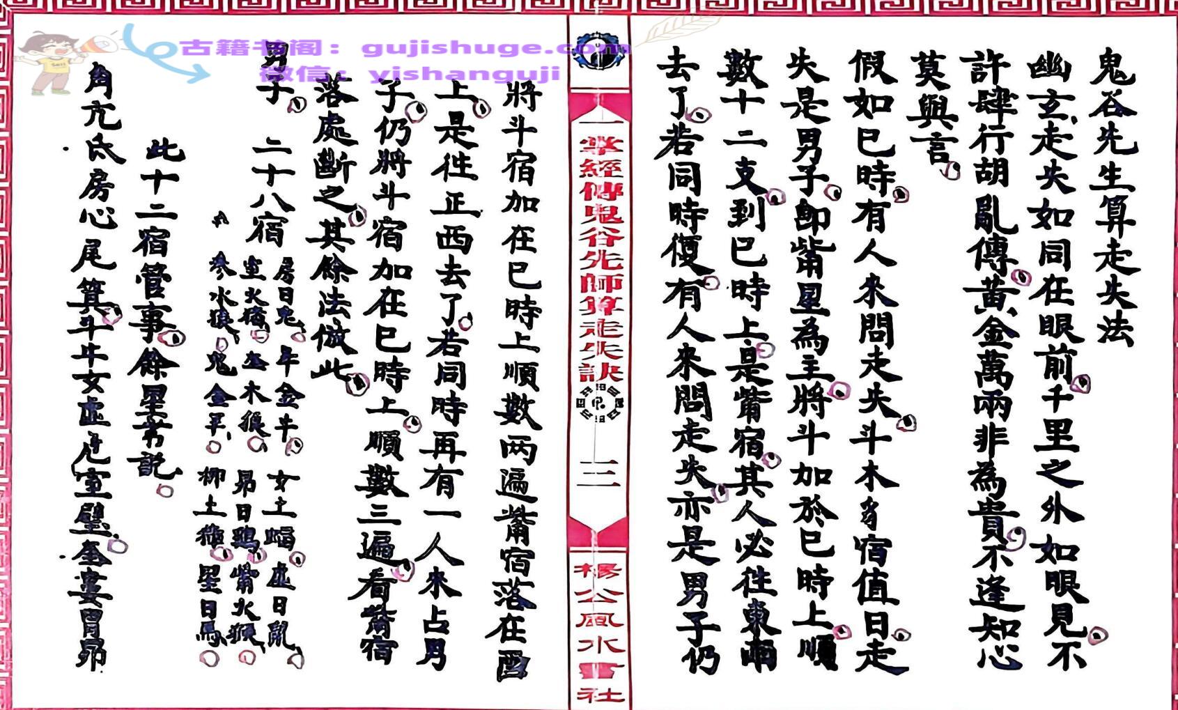 内容:二十八宿演禽走失全书歌、鬼谷先生算走失法、走失男子方向诀、走失妇人方向诀、走失小儿方向诀、走失幼女方向