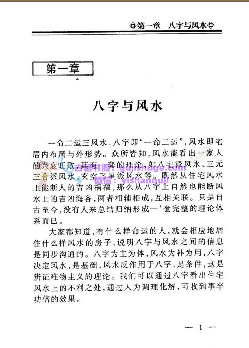 一命二运三风水,八字即“一命二运”,风水即宅居内布局与外形势。众所皆知,风水能看出一家人的兴衰旺败,其有一套的理论,如八宅派风水、三元三合派风水、玄空飞星派风水等。既然从住宅风水上能断人的吉凶祸福,那么从八字上自然也能断风水上的吉凶悔吝,两者相辅相成,互相关联。只是自古至今,没有人来总结归纳形成一套完整的理论体系而已。