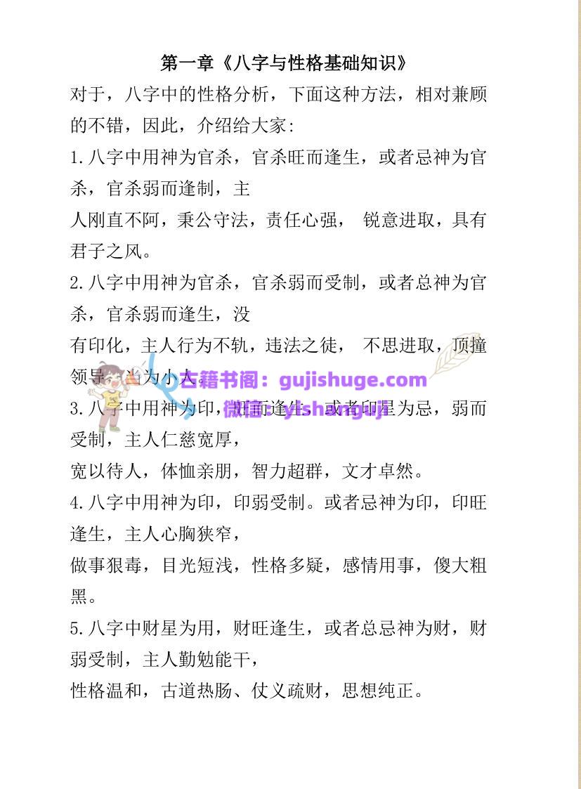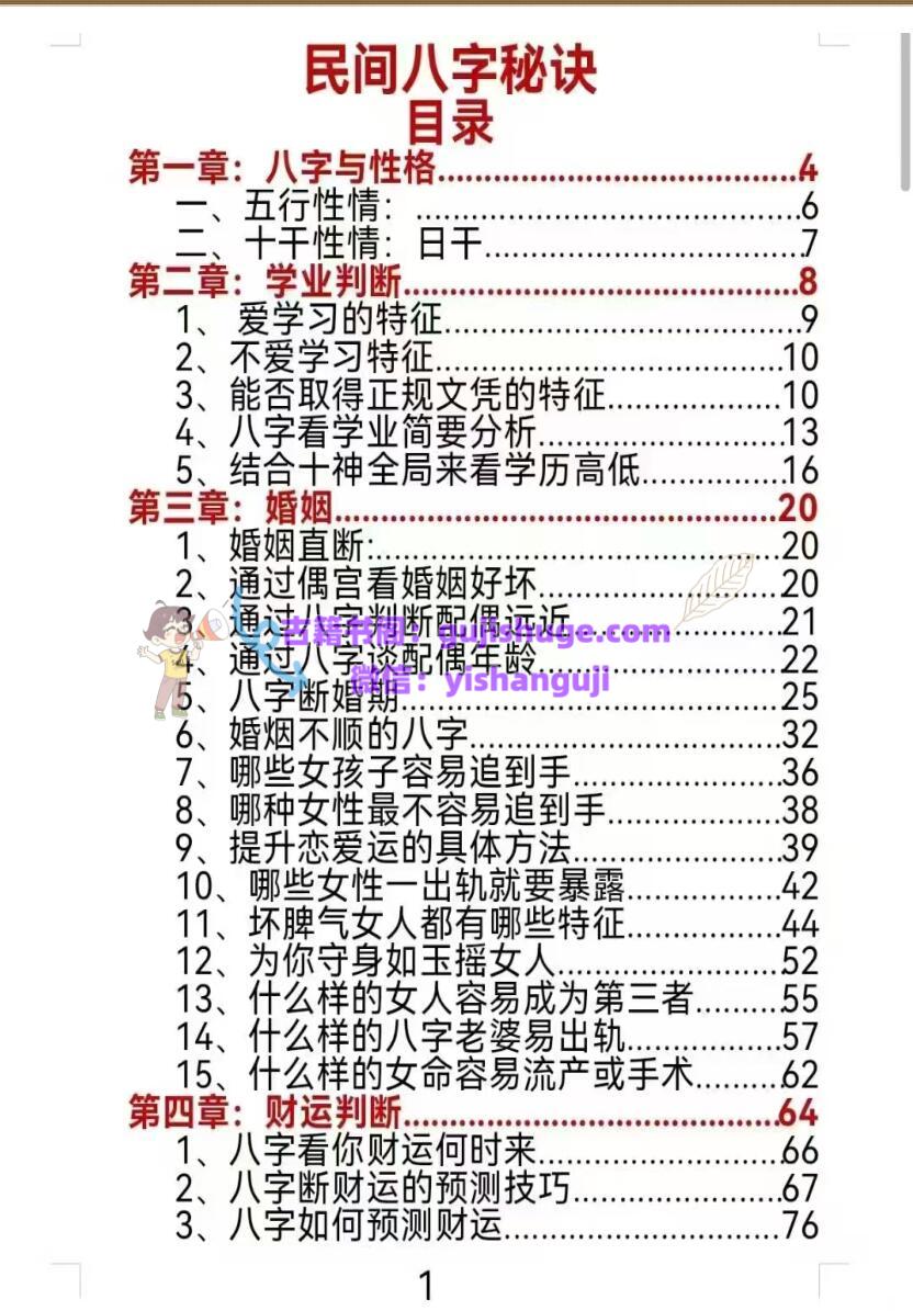 内容有:五行性情、十干性情、爱学习的特征、不爱学习特征、能否取得正魏文凭的特征、八字着物业简要分析、婚姻直断、八字断婚期、婚姻不顺的八字、哪些女孩子容易追到手、坏脾气女人都有哪些特征、为你守身如玉的女人等等。
