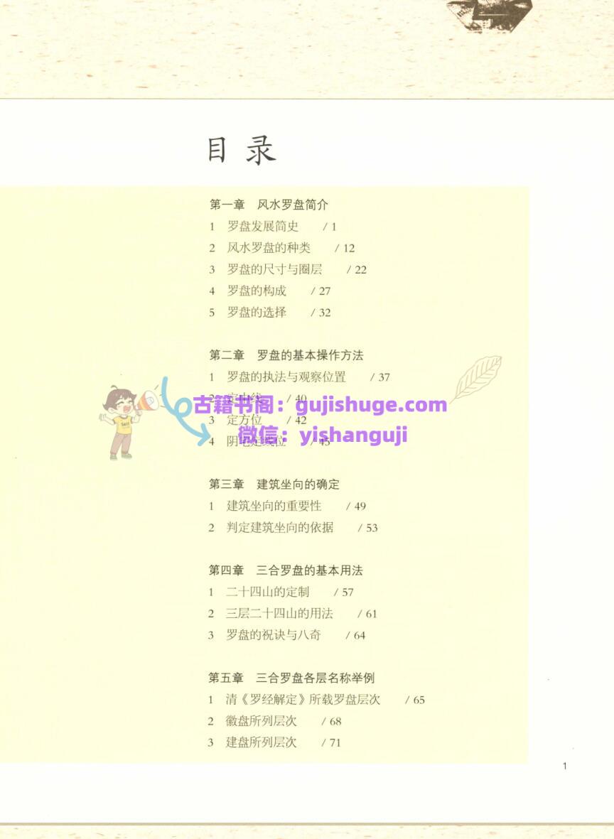 罗盘,古称罗经、罗镜、经盘、罗经盘、子午盘、风水罗盘,是中国古代堪舆家从事堪舆活动必不可少的工具。本书系统介绍了中国风水罗盘的生产、发展以及其基本使用方法,重点以“徽盘”为例,详解了三合罗盘十八层各层盘面的含义和用途,并指出其合理成分与玄学色彩,使读者了解罗盘的本来面目,即除了用于指向定位,确认环境要素之关系和记录一些古代天文、地理、历法、气候及历史知识外,罗盘中的许多圈层是没有什么实际用途的。罗盘作为一个历史存在、如今还在民间流传的事物,对于我们借助其研究历史建筑与环境,以及民俗文化等方面还是具有一定价值,辩证地认识它的面目还是有必要的。