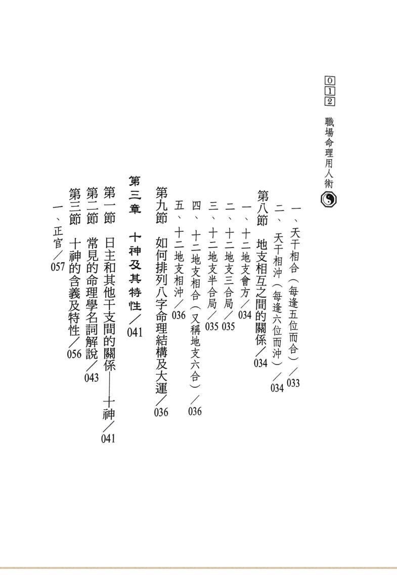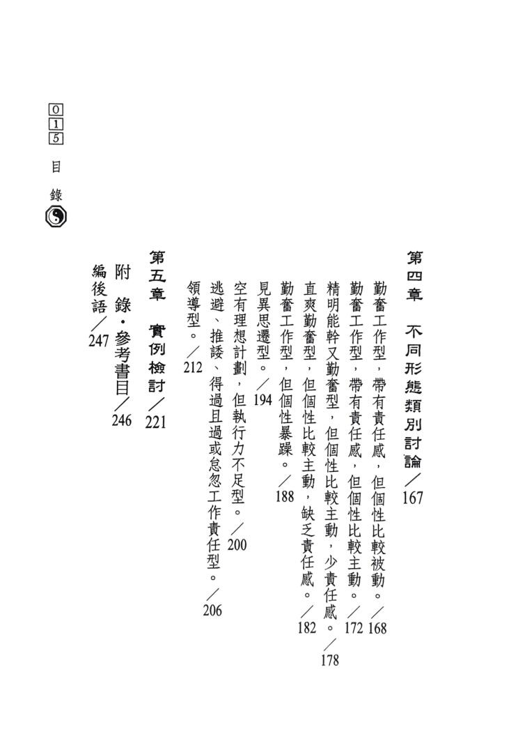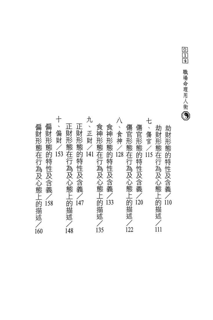 本书内容详细说明八字命理心理学中,有关「用人术」的观念,浅显易懂,读者可轻鬆运用。不管您是老板或员工,本书以不同于传统的观点,全新的用人概念,提升您在职场中观察人类行爲、心态或肢体语言的能力,并藉以修正个人的缺点。期望透过本书的学习,使读者在人生旅途中,知己知彼,自我改进,发挥所长,让自己有更多成长的空间。