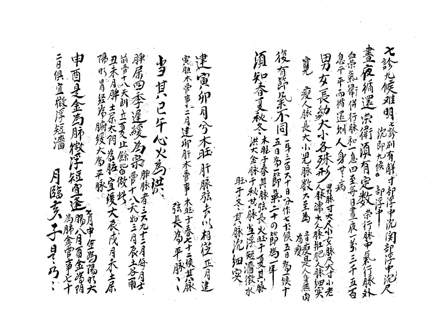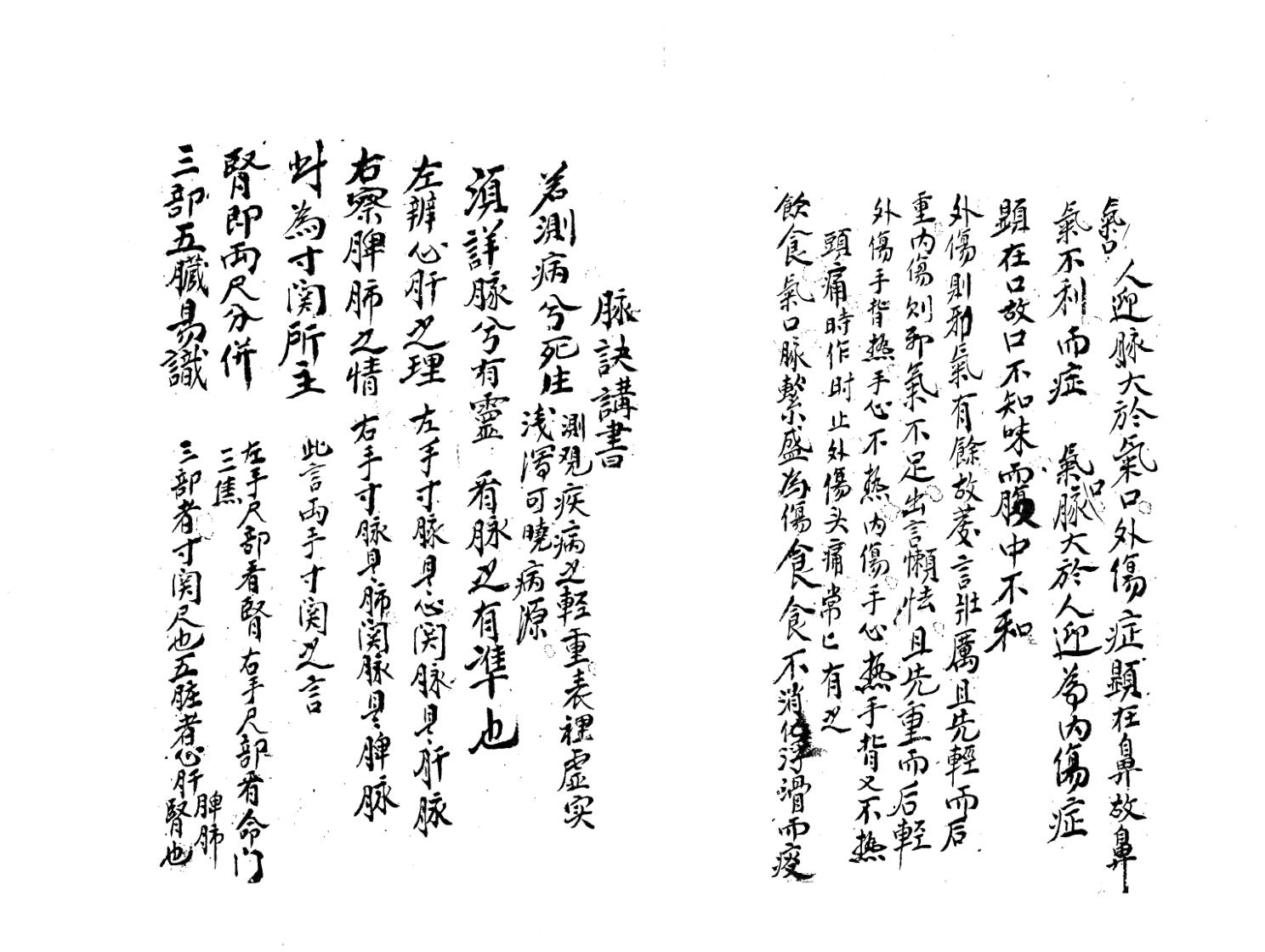 左手诊脉式、右手诊脉式、脉诀講書、看寸脉、看関脉、看尺脉、看胎脉、诊脉入式歌、七表脉详解、八裹脉、九道脉、心脉三部、脾脏歌、肺脏歌、左手指式、右手指式、七表指式、八裹指式、九道指式、四季脉、三部九候之说、隂症傷寒、诊五脏六腑气绝死症、小隂肿胀等等。
