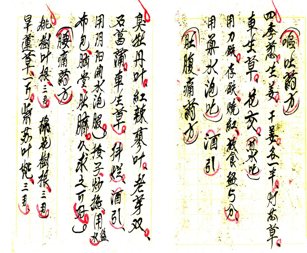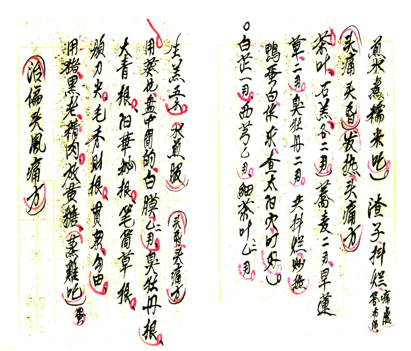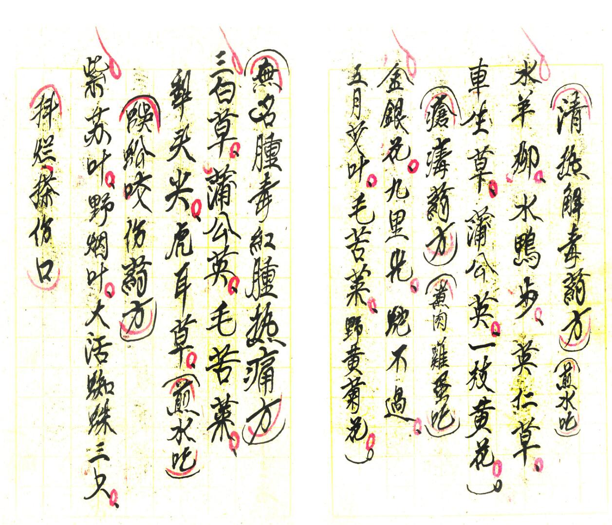 清火解毒药方、治目赤腫痛方、疮毒药方、无名腫毒红腫热痛方、蜈蚣咬伤药方、治疟疾药方、治痢疾药方、呕吐药方、腰痛药方、治火烧伤药方、治白喉病方、小儿吐乳药方、月经不调药方、避孕药方等等;下册共80页,内容有:封血灵药方、治偏头风痛方、鱼骨哽咽喉不动方法、癫狂病丸药方、治生虫疮方法、治暗针方法等等。