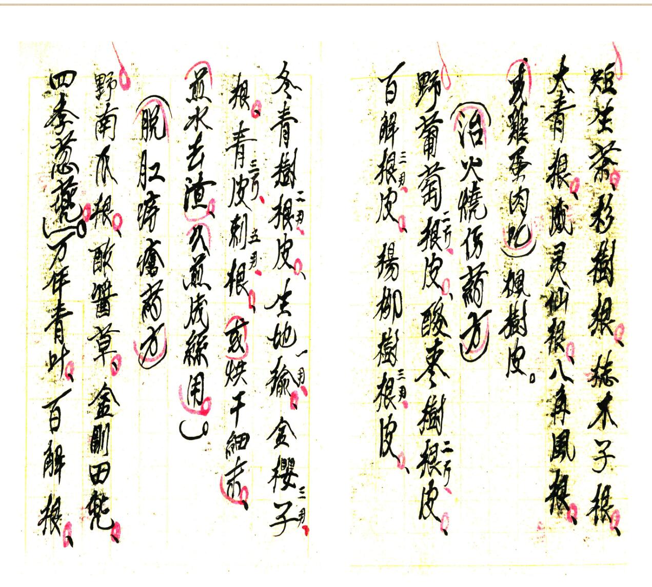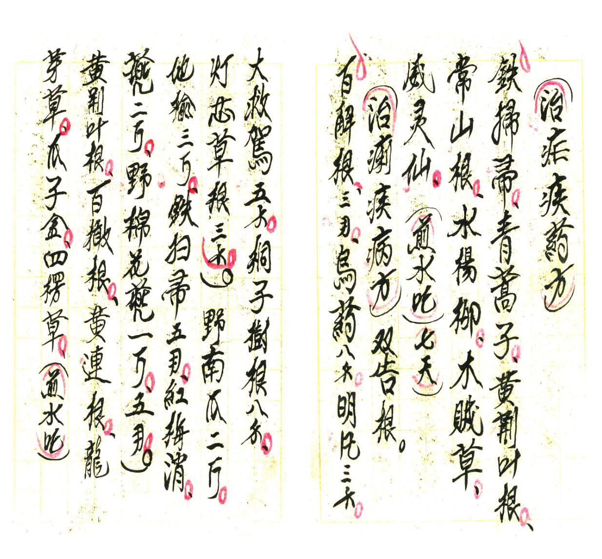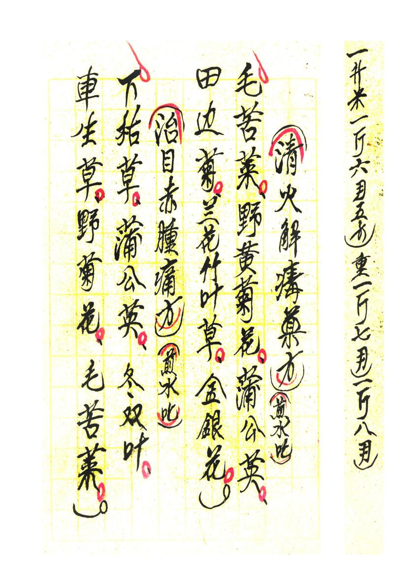 清火解毒药方、治目赤腫痛方、疮毒药方、无名腫毒红腫热痛方、蜈蚣咬伤药方、治疟疾药方、治痢疾药方、呕吐药方、腰痛药方、治火烧伤药方、治白喉病方、小儿吐乳药方、月经不调药方、避孕药方等等;下册共80页,内容有:封血灵药方、治偏头风痛方、鱼骨哽咽喉不动方法、癫狂病丸药方、治生虫疮方法、治暗针方法等等。