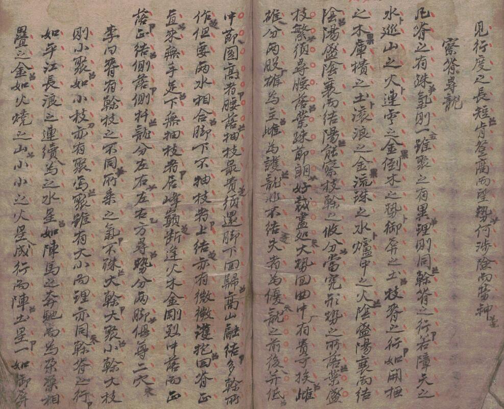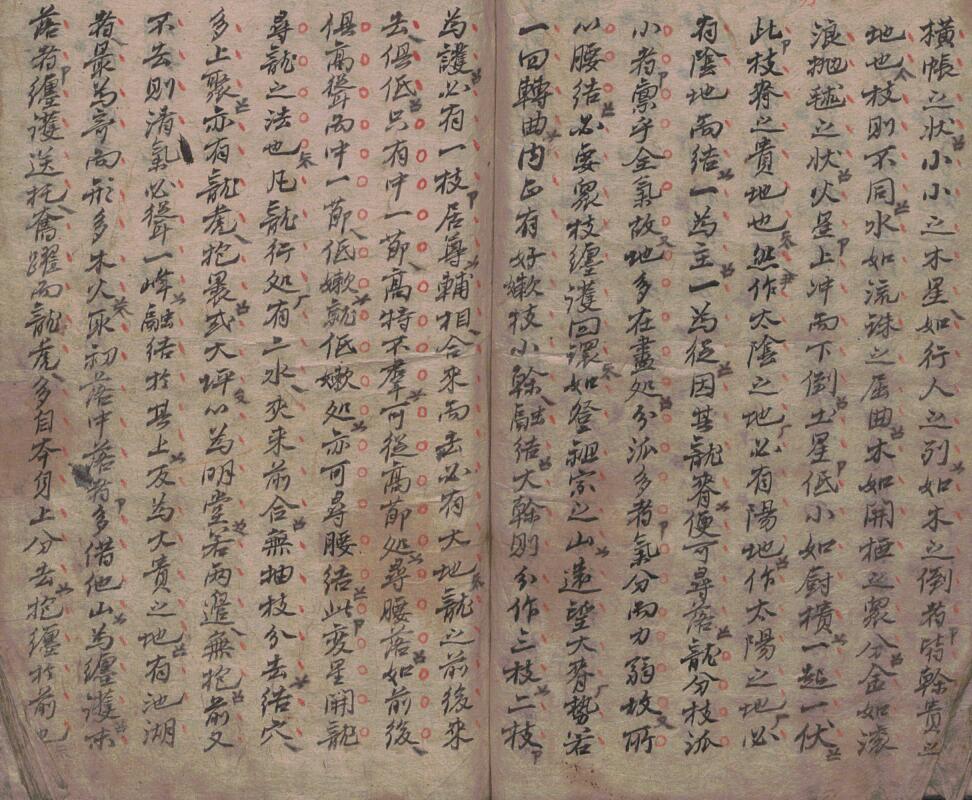 注:脊有干枝之不同,所乘之气不殊,大干大聚,小干大枝则小聚,如小枝亦有聚焉,聚虽有大小而理亦同,干脊之行,有如平江长浪之连续,为之水星。如阵马之奋勇,乃相叠之金。如火烧山,小小之火星成行而阵,土星一如御屏横帐之状,小小木星如行之列,如木之倒者,皆干贵之地,枝则不同,如流珠之屈曲,如木开桠之象分,金如滚浪抛毬之状,火星在冲而下倒,土星低小如厨库,一起一伏,此枝脊之贵地,然作大阴地之处必有阳地,而阳地处亦有阴一,一为主一为从,因其龙脊可便寻落,然龙分枝派少者,则禀乎全气,故地多在尽处,分派多者气亦分而力弱,所以腰结,然要众枝缠护回环,如登祖宗山远望大势,若一回转曲内定有好嫩枝小干融结,然大干分作三枝,二枝为护,必有一枝居尊辅,相合来去,必有大地,行龙前后来去俱低,只有中一节高特不群,可从高节处寻腰结,此变星间星寻龙之法也,凡龙行有二水夹来前合,无抽枝分去,结穴多上聚,亦有龙虎包裹,或大坪以为明堂,或两边无包,前又不去,则清气必耸一峰,融结于其上,反为大贵之地,有池湖者最为奇物,多木火取初落中落者,皆多借他山不缠护,若未落者缠送转托奋迹,龙虎多自本身上分去,包缠天前也,若干落之祖峰端严而正尊,穴居其正,若面倒向左则结在左边,宜向左寻穴,右亦。然祖宗起峰秀丽均匀,两脚垂下相对,则结兄弟二穴。