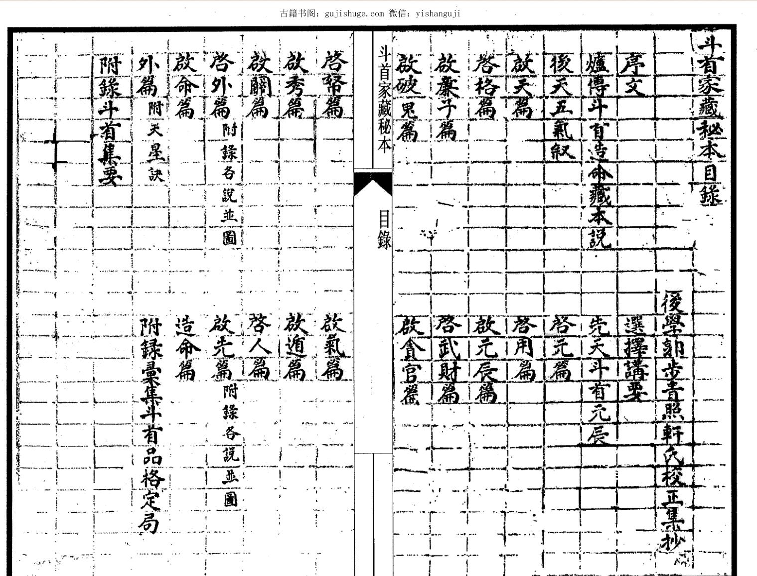 炉传斗首造命藏本说,后天五气叙,啟天篇,啟格篇,启廉子篇,启破鬼篇,启帑篇,启秀篇,啟关篇,启外篇(附录各说并图),启命篇,外篇(附天星诀),附录斗首集要,选择讲要,先天斗首元辰,启元篇,启用篇,启元辰篇,启武财篇,启贪官篇,启气篇,启遁篇,启人篇,启先篇(附录各说并图),造命篇,附録汇集斗首品格定局。