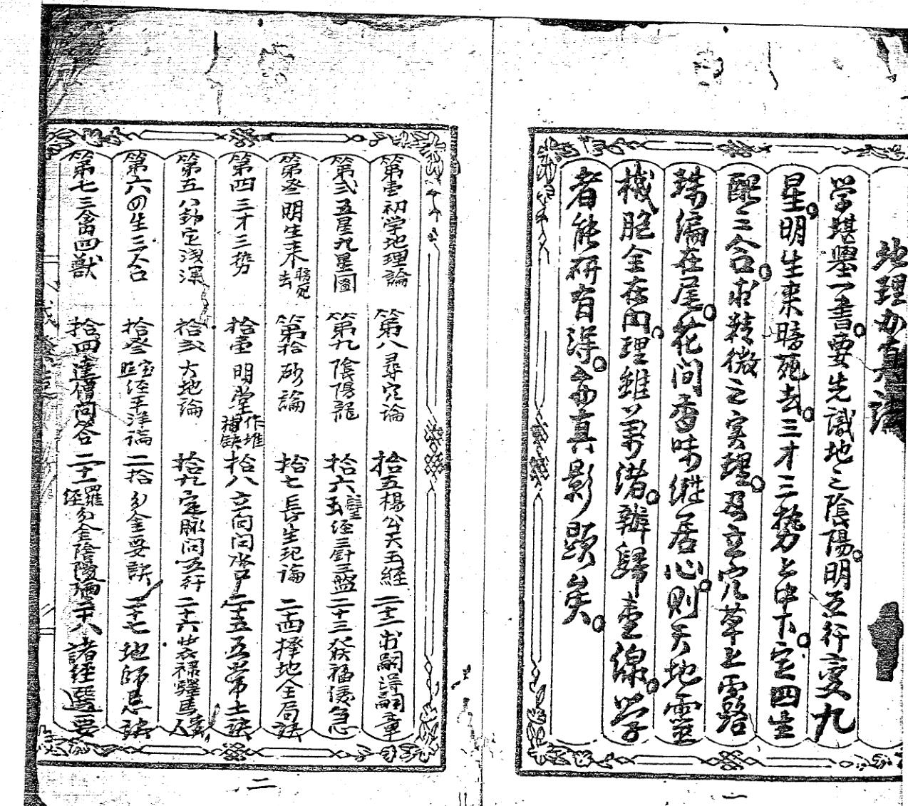 71页内容包括:初学地理论,五星九星图,明生来去,三才三势,四生三合,三禽四獸,寻穴论,阴阳龙,砂论明堂做堆补缺,大地论,宝照经平洋篇,达僧问答,杨公天玉经,碧玉经三针三盘罗经篇,长生玘法,立向问水口论,定脉问五行论,分金要诀论,罗经分金阴阳论,求嗣得嗣章,发福年月缓急诀,地全局十三诀,五常论,禄马贵人星论,地师禁忌诀,诸经选要列等。