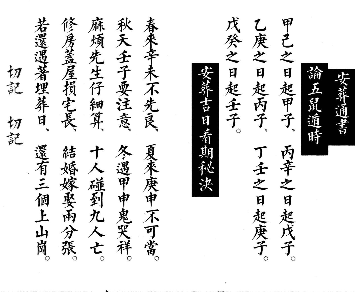 内容有:论五鼠遁时、安葬吉日看期秘诀、论五音大葬日、论五音小葬日、论斩草破土吉日、论逐月斩草破土吉日、论逐月安葬吉日等。