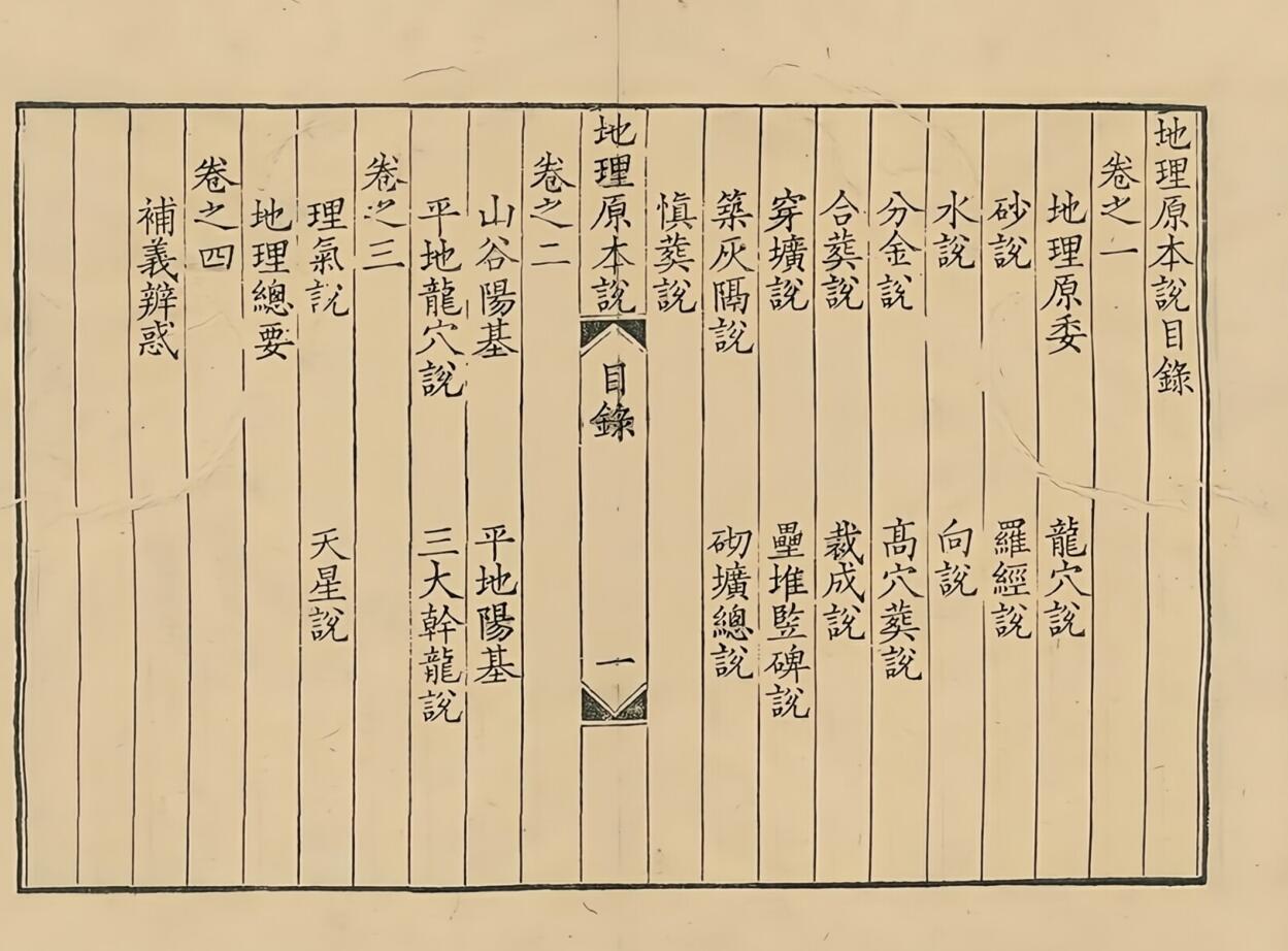 内容目录包含:第一册目录 自序 地理原本说目录 曹安峰地理原本说卷之一 地理原委 龙穴说 砂说 罗经说 水说 向说 分金说 髙穴□说 合□说 裁成说 穿圹说 垒堆□碑说 筑□隔说 砌圹总说 愼□说 曹安峰地理原本说卷之二 山谷阳基 平地阳基 平地龙穴说 三大干龙说。第二册目录 曹安峰地理原本说卷之三 理气说 天星说 地理总要 曹安峰地理原本说卷之四 补义辨惑 跋。