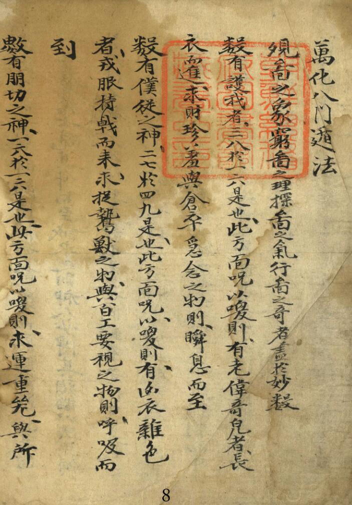 《奇门步斗调坛万化诀》为清代早期名师亲传秘本,全书182页详载奇门遁甲与步罡踏斗秘术。开篇以“万化八门遁法叙”总摄天地人三才奥秘,配以“八门调坛寻方位图”“寻月轮图”构建时空坐标体系。核心收录“八奇方假令”“八门调坛罡咒”“七星诀”“八卦诀”等符咒秘法,更含“气诀”“叩齿咒”“变化咒”等内炼口诀。书中独创“真人步斗法”“步斗图兼步斗咒”体系,配以“出天门咒”“入地户咒”“八局咒”等移动法咒,形成完整的行坛步斗仪轨。此外,详述“十干符”“九星八门符”“玄女符”“真人六戊符”等符箓绘制秘法,以及“桑柳童子法”“横闭局法”等特殊法术。这部玄门秘典从方位调遣到符咒通神,从步斗罡诀到内炼气法,完整呈现清代奇门遁甲与道教法术的巅峰技艺。
