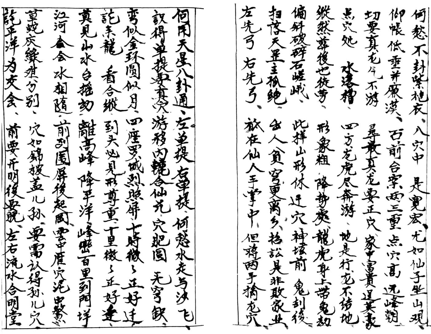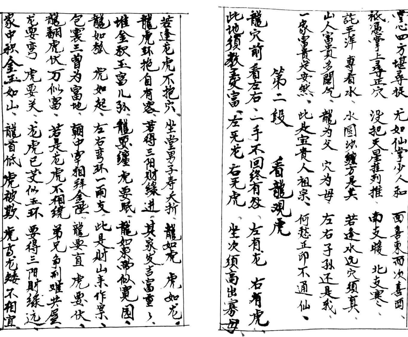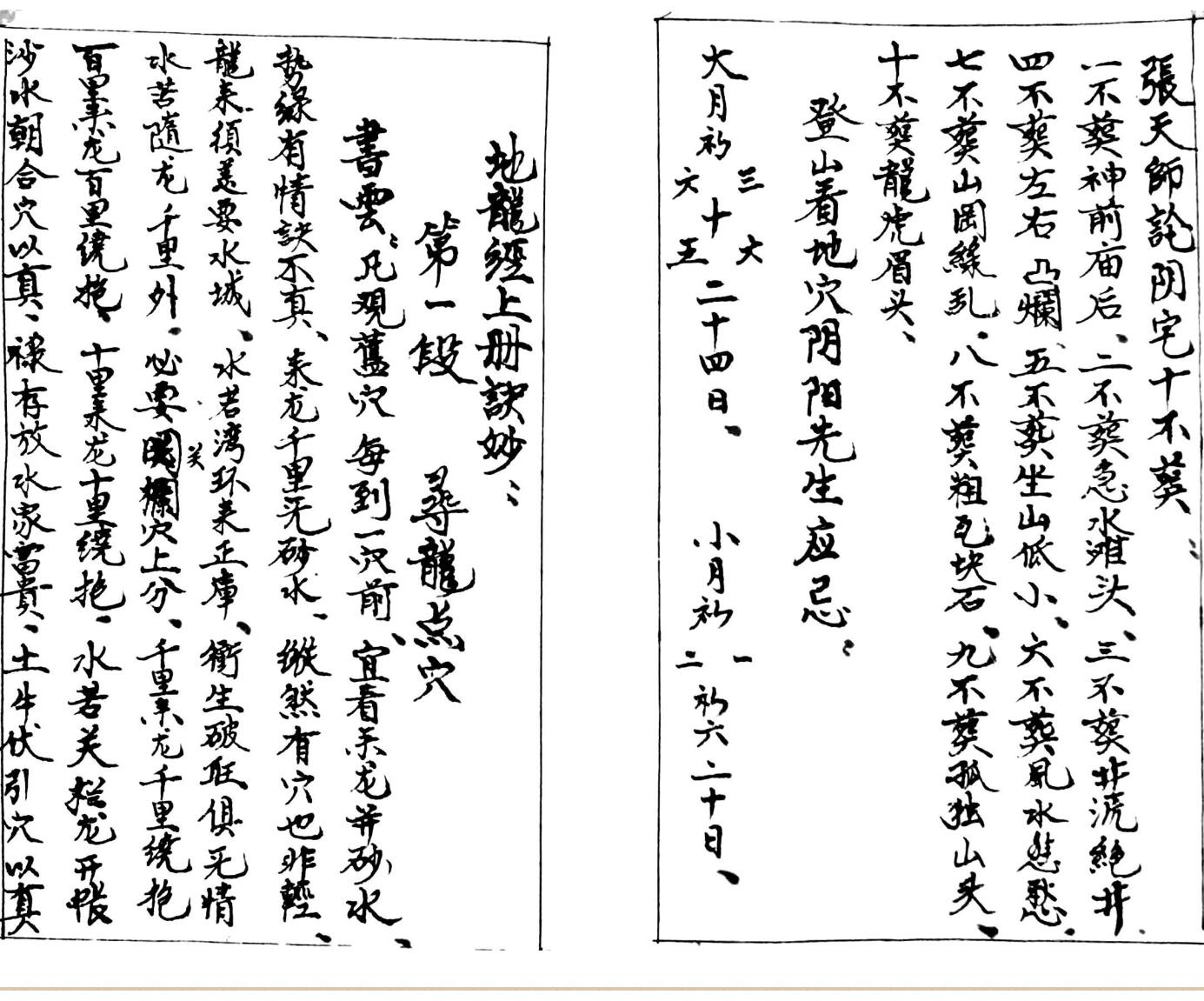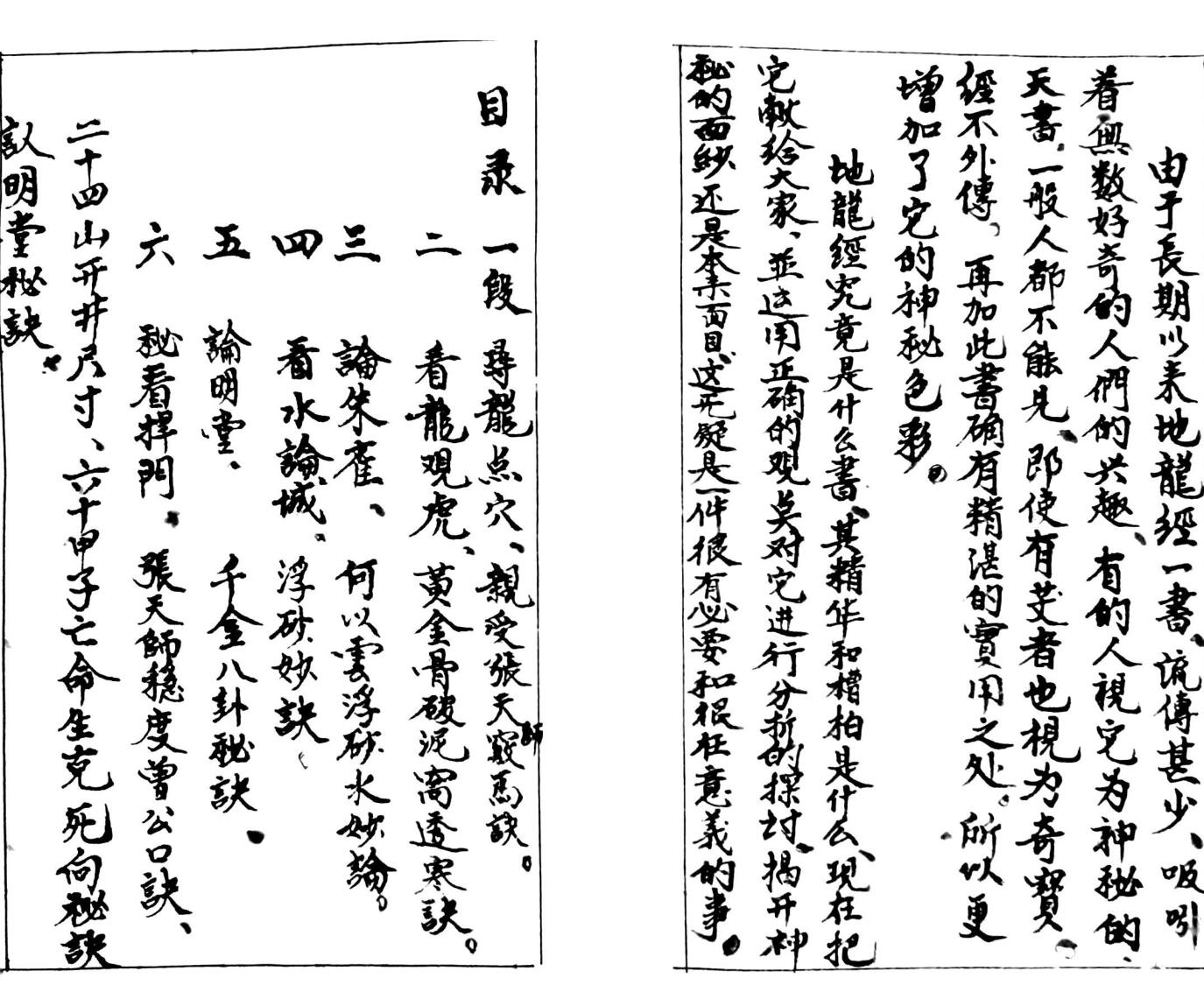 内容有:上册诀妙,下册诀窍,寻龙点穴,親受张夭师窍马诀,看龙观虎,黄金骨破泥窝透寒诀,论朱雀,何以雲浮砂水妙论,看水论城,浮砂妙诀……
