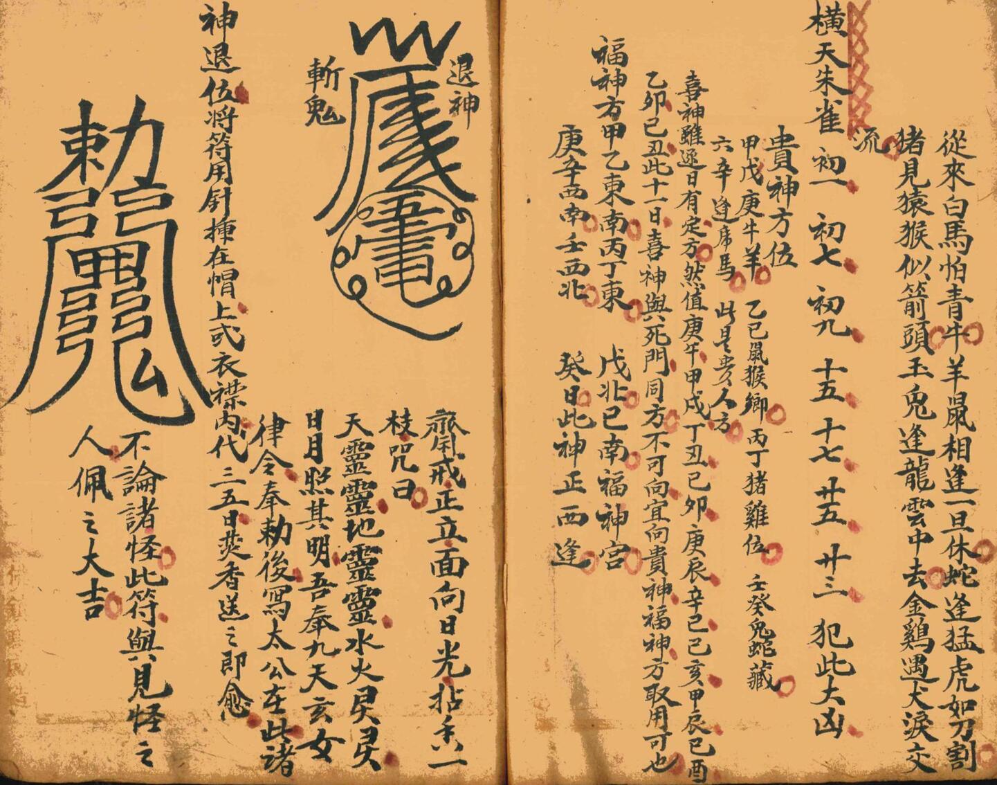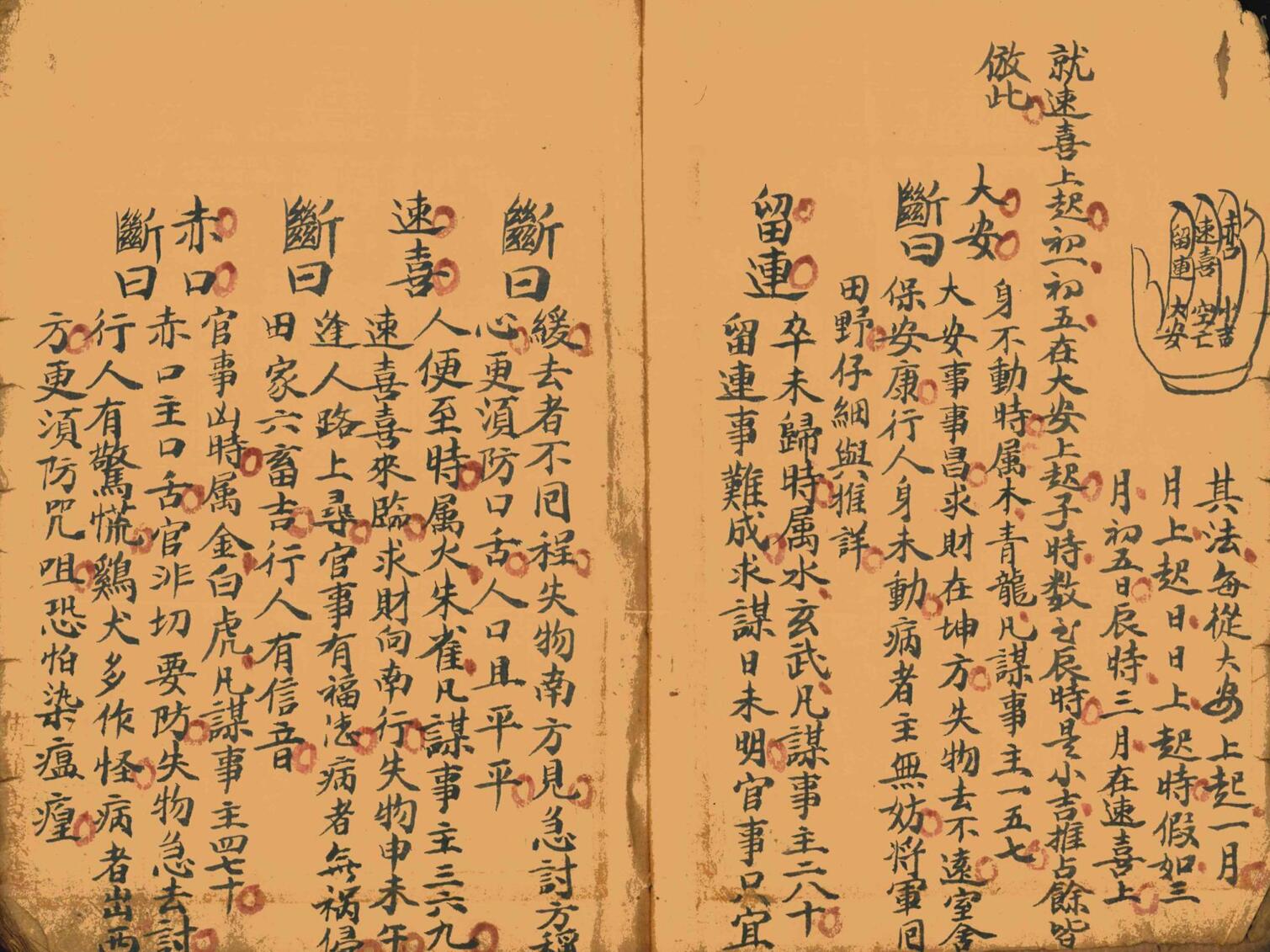 民间择日书《禄马神验定生死吉凶诀》择日择吉相关古籍,内容包含:禄马神验定生死吉凶诀、占春夏秋冬风雨、嫁娶总论、大小月周堂摘要、1-12月不将吉日、杨公忌日、安葬吉日、安床方向、婚姻匹配要诀、初一到三十日得病如何化解、镇诸怪符法、五雷咒、大人小孩失魂收魂咒、护身咒、治牙痛咒、六十花甲子纳音吉神方位、二十八宿吉凶等。