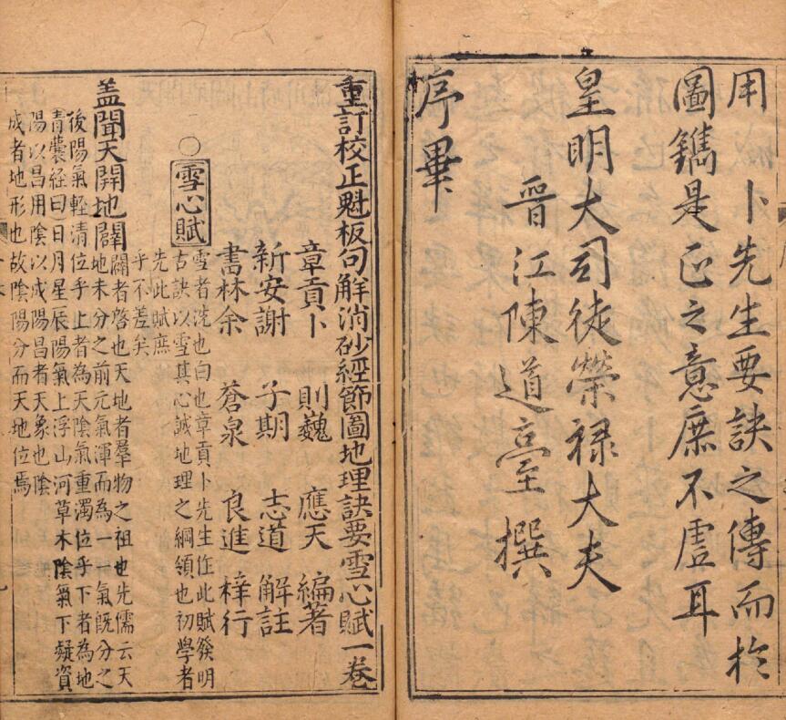 《雪心赋》是唐朝卜应天所著。卜应天世居赣州,荐太史不就而入道门为黄冠师。《雪心赋》是中国堪舆学中的名篇名著,是形势法(峦头法)风水的经典作品。此本《重订校正魁板句解消砂经节图地理诀要雪心赋》明谢志道注,为明万历30年(1602)余氏怡庆堂刊本。
